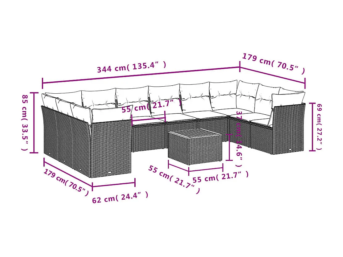 Set de sofás de jardín 11 pzas y cojines ratán sintético gris