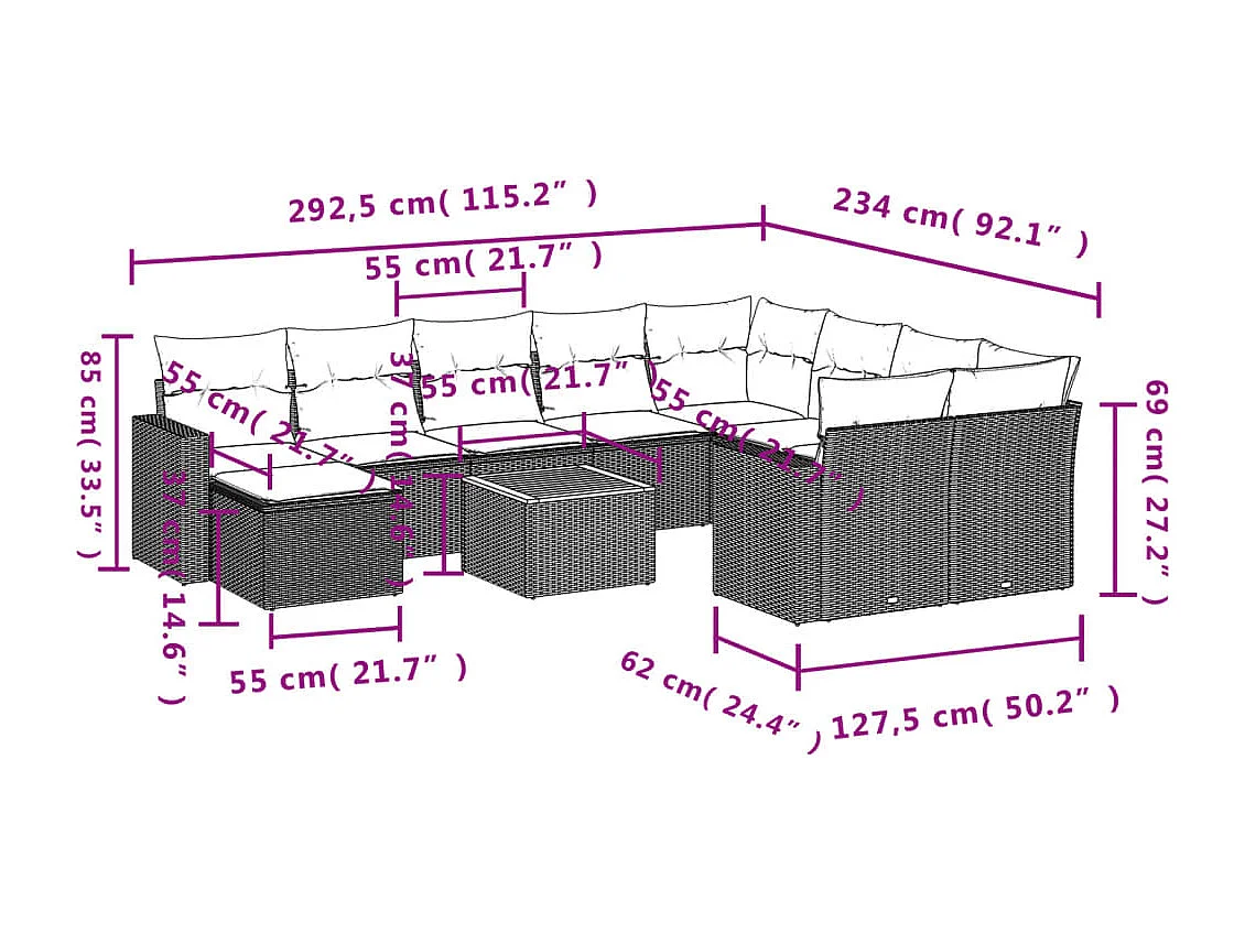 11 muebles de jardín con cojines de resina tejida en color beige.