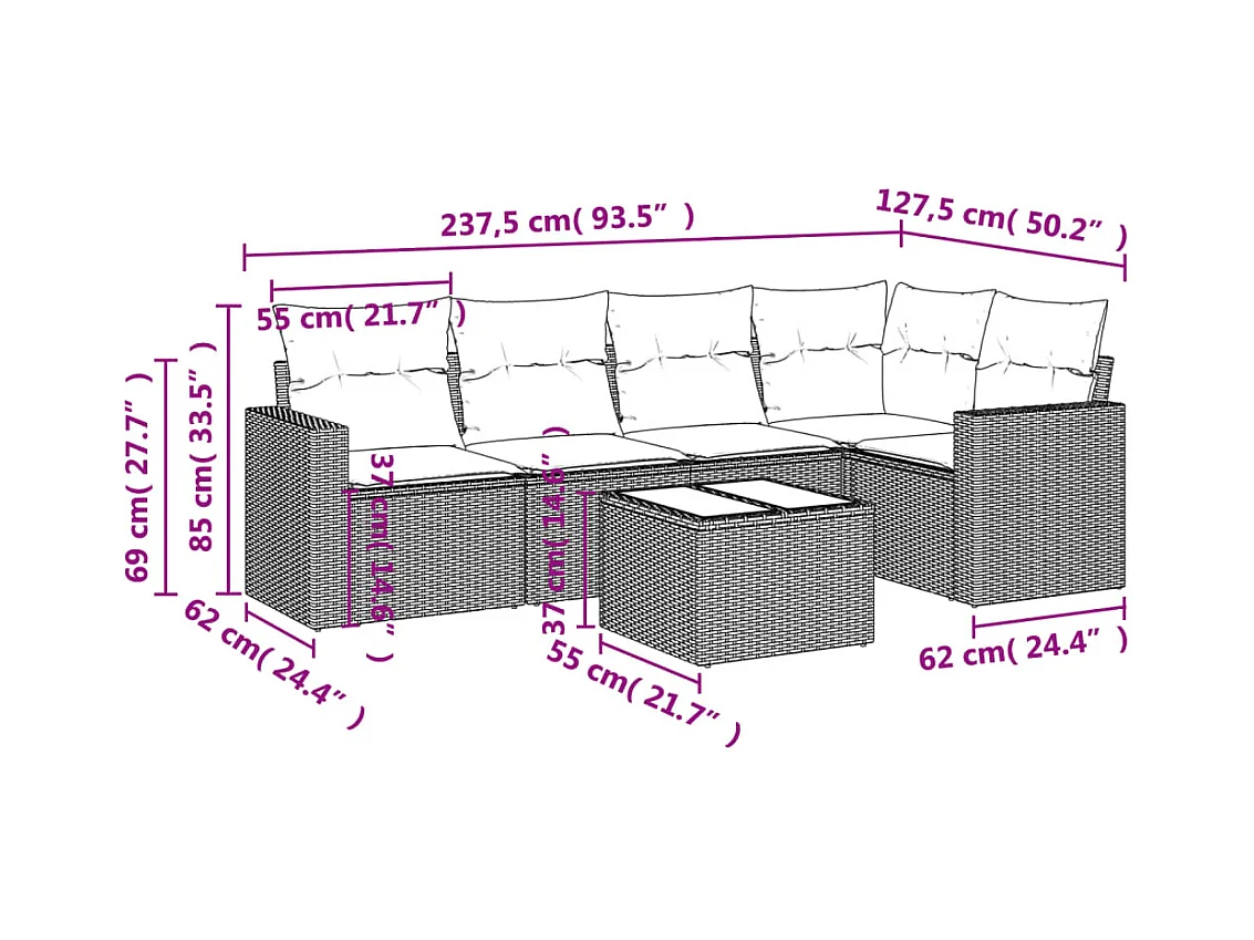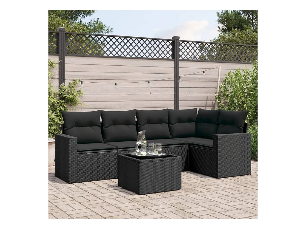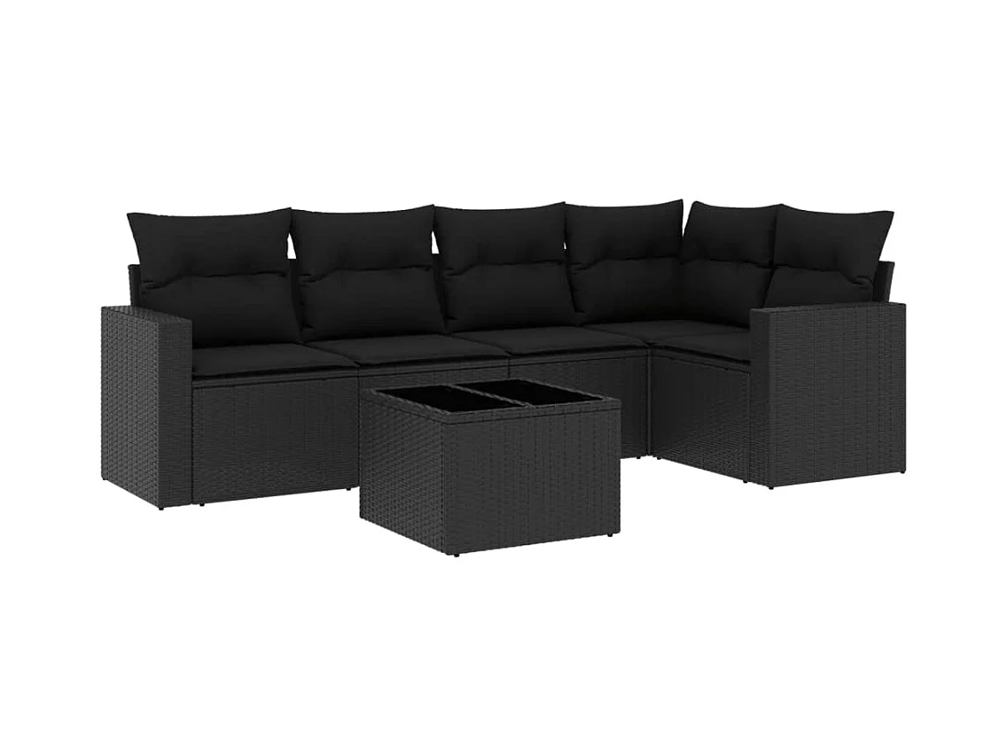 Muebles de jardín de 6 piezas con cojines de resina tejida en negro.