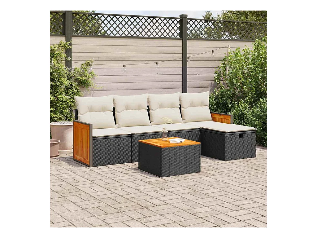 Set de sofás de jardín 6 piezas y cojines ratán sintético negro