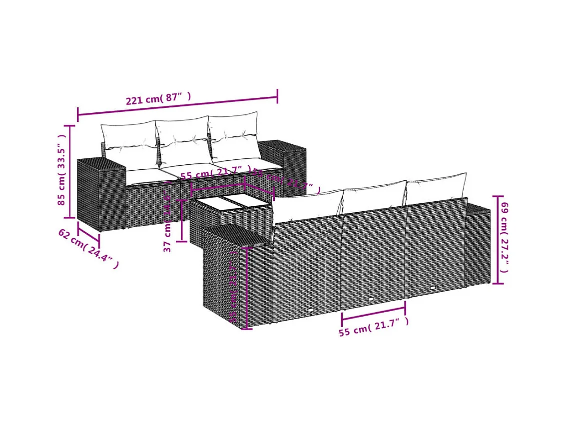 Muebles de jardín de 8 piezas con cojines de resina tejida gris.