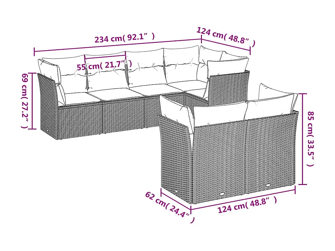 Set de sofás de jardín 7 piezas con cojines ratán PE gris claro