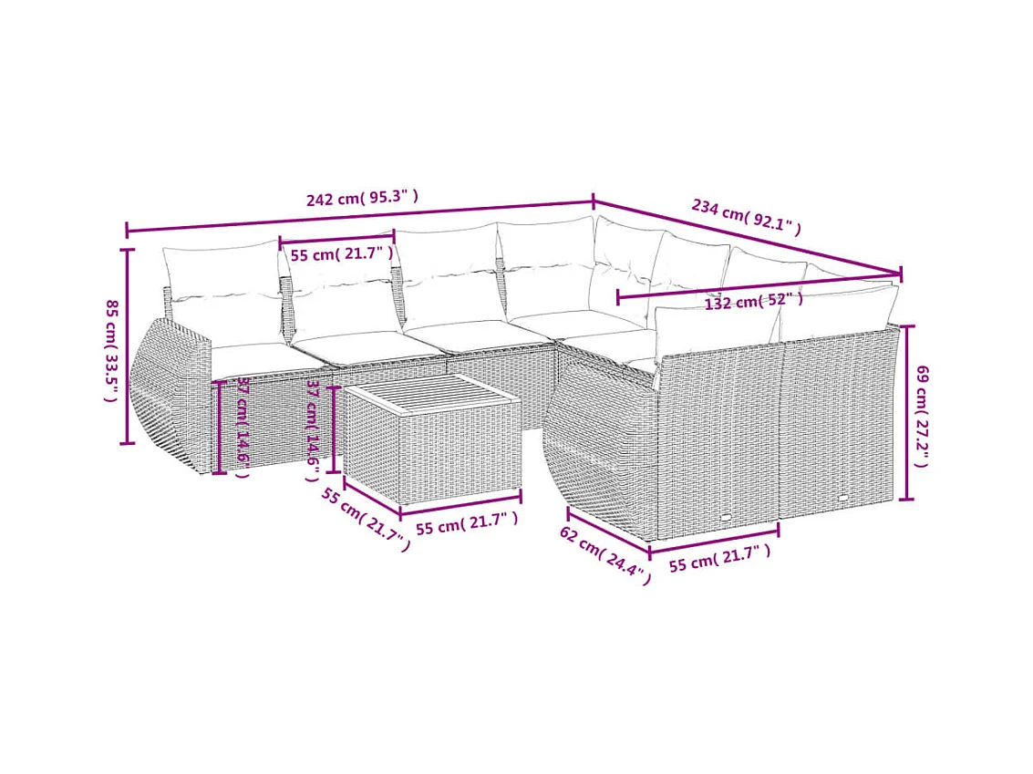 Set de sofás de jardín 8 piezas y cojines ratán sintético negro