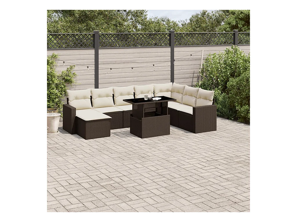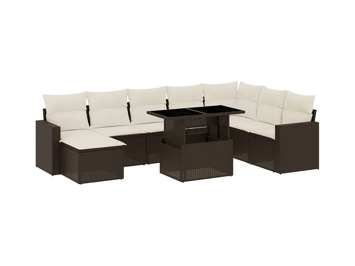 Set de sofás de jardín 9 piezas y cojines ratán sintético marrón