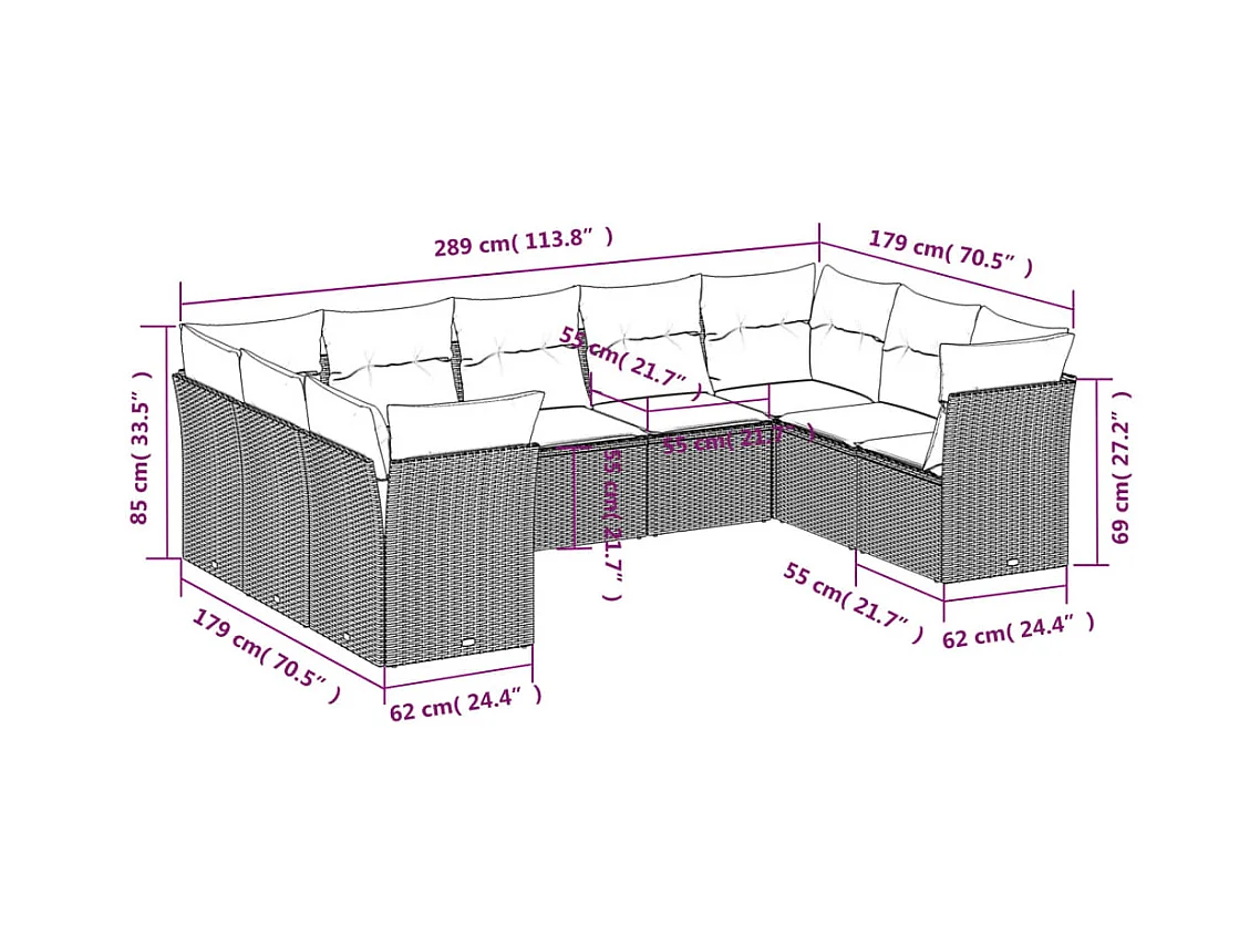 Set de sofás de jardín 10 pzas y cojines ratán sintético marrón