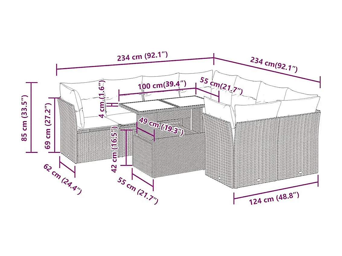 Set de sofás de jardín con cojines 9 pzas ratán sintético gris