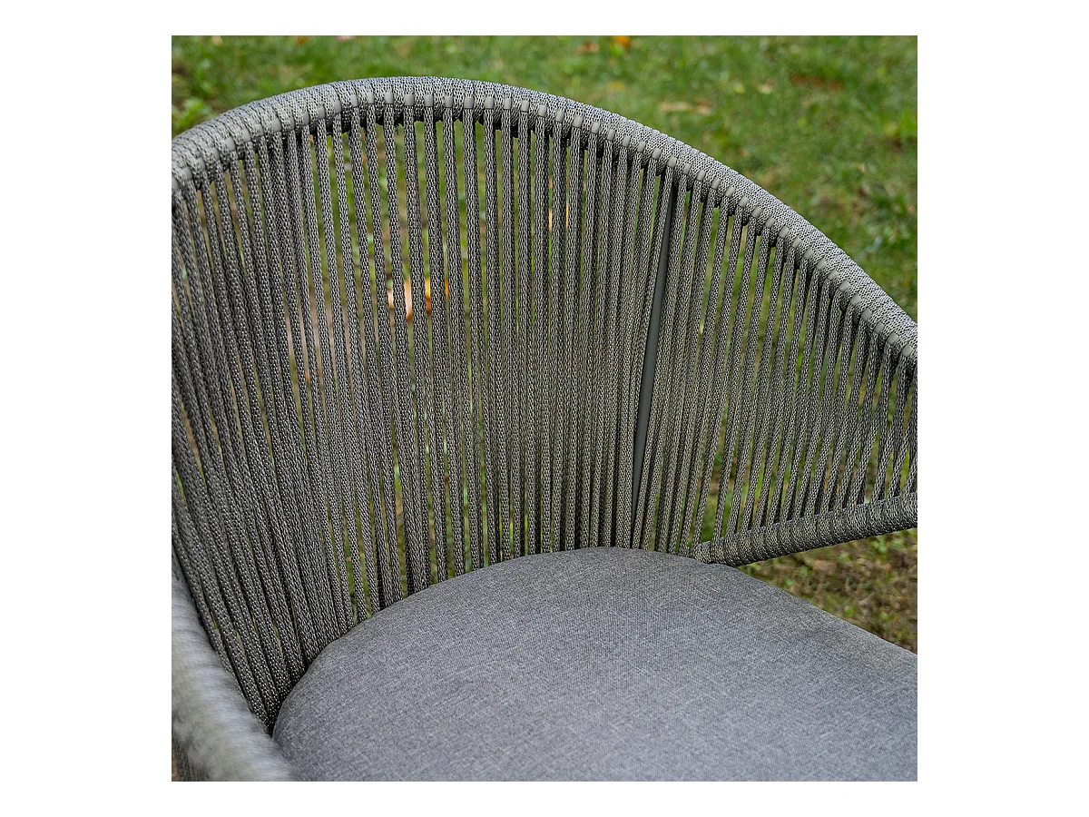 11 muebles de jardín con cojines de resina tejida en gris.