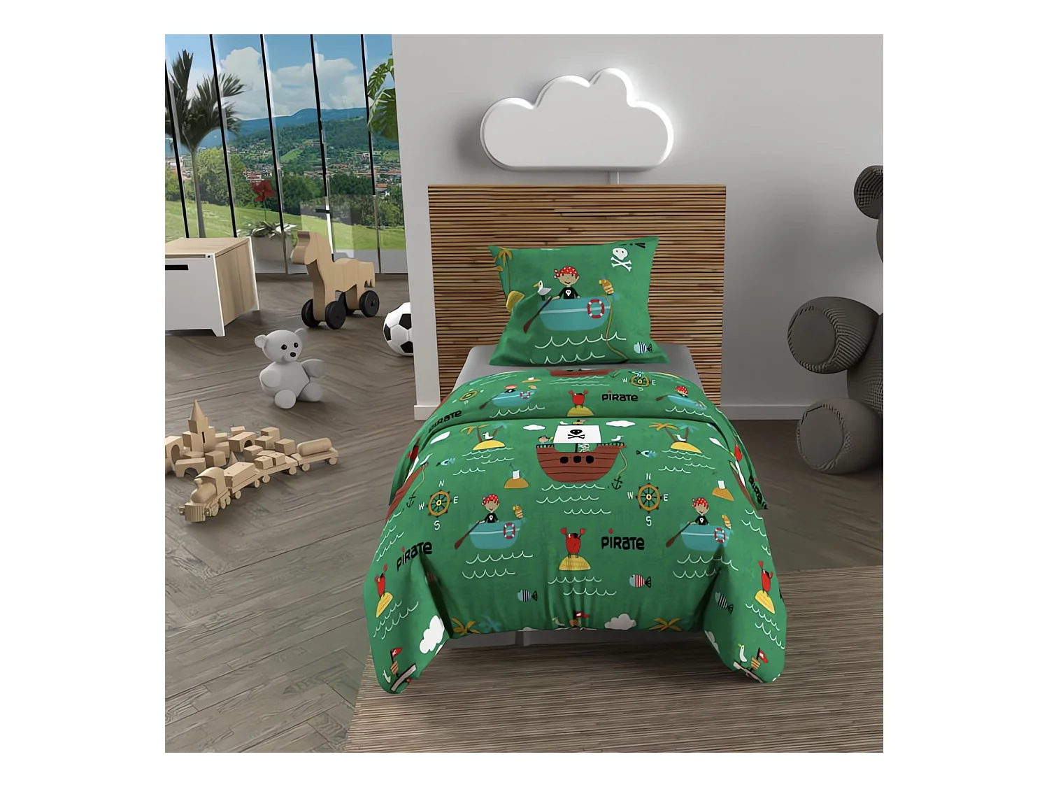 Set funda nórdica 120x150 cm PIRATAS verde, 100% algodón 57 hilos/cm2