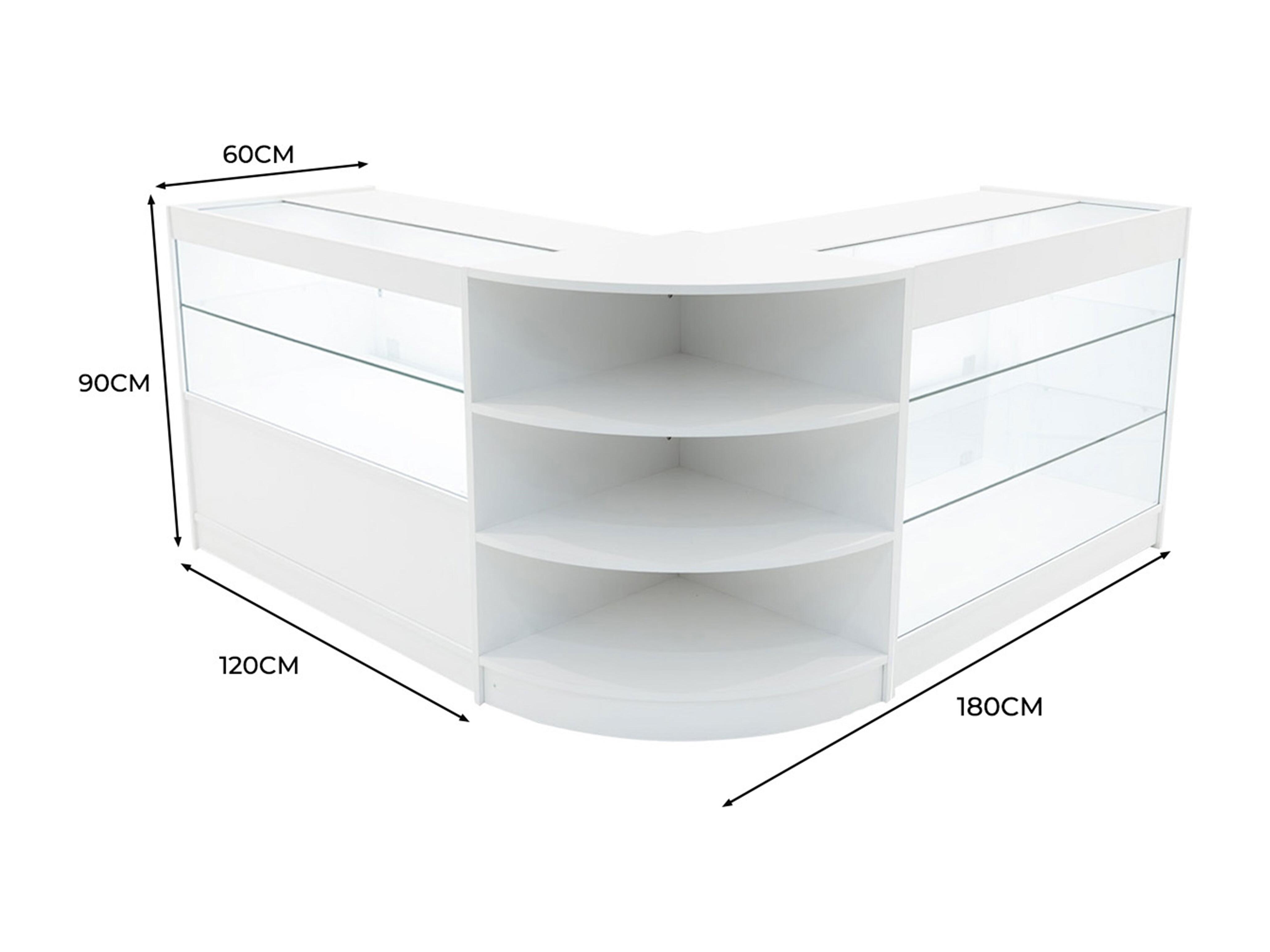Todos los mostradores de esta gama están fabricados en MDF de alta calidad y terminados en melamina blanca resistente, lo que combina durabilidad con una estética moderna y limpia. Los modelos K1200 y C1200 también cuentan con paneles de vidrio templado, ofreciendo una superficie de exposición premium que realza el acabado profesional general. Toda la colección está diseñada para soportar el uso intensivo de entornos comerciales con alto tráfico.