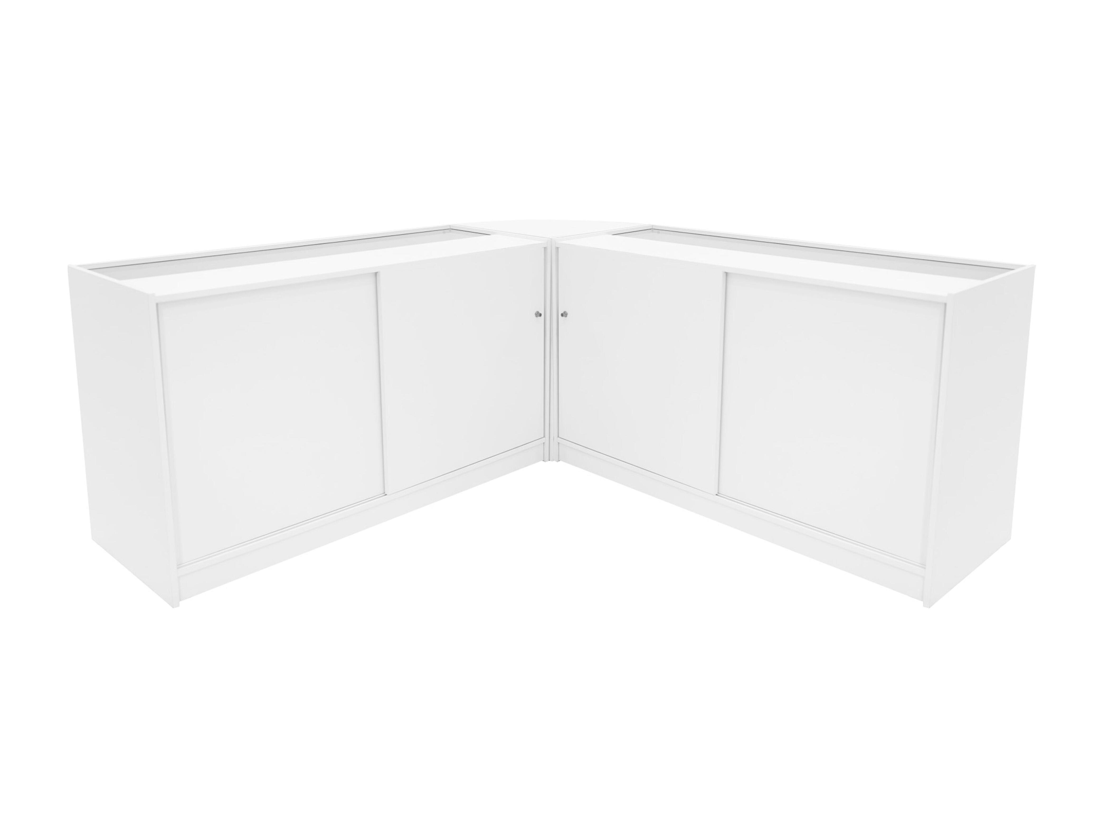 El mostrador de esquina curvo LM60 añade funcionalidad ahorrando espacio y favorece un flujo armónico en la distribución del local. Su diseño compacto permite integrarse fácilmente en esquinas o unirse con mostradores rectos para formar una configuración uniforme. El LM60 incluye tres estantes abiertos orientados al cliente, que maximizan la visibilidad y accesibilidad de los productos, siendo la solución perfecta para aprovechar rincones sin afectar la estética general del espacio.