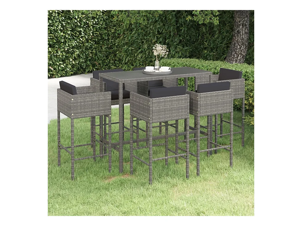 Set de bar para jardín 8 piezas y cojines ratán sintético gris