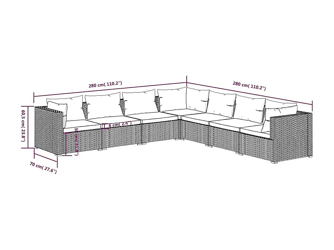 Set muebles de jardín 7 piezas y cojines ratán sintético marrón