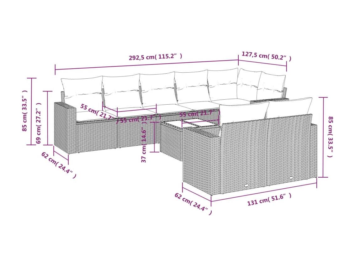 Set muebles jardín 9 piezas y cojines ratán sintético gris claro