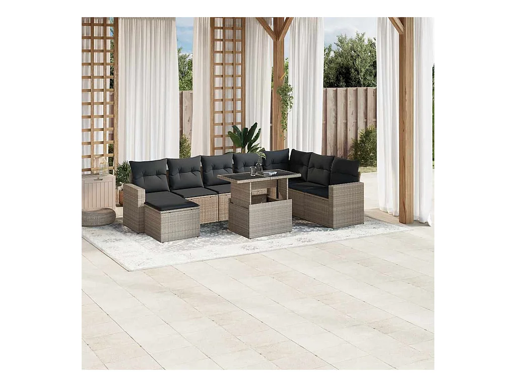 Set muebles jardín 9 piezas y cojines ratán sintético gris claro