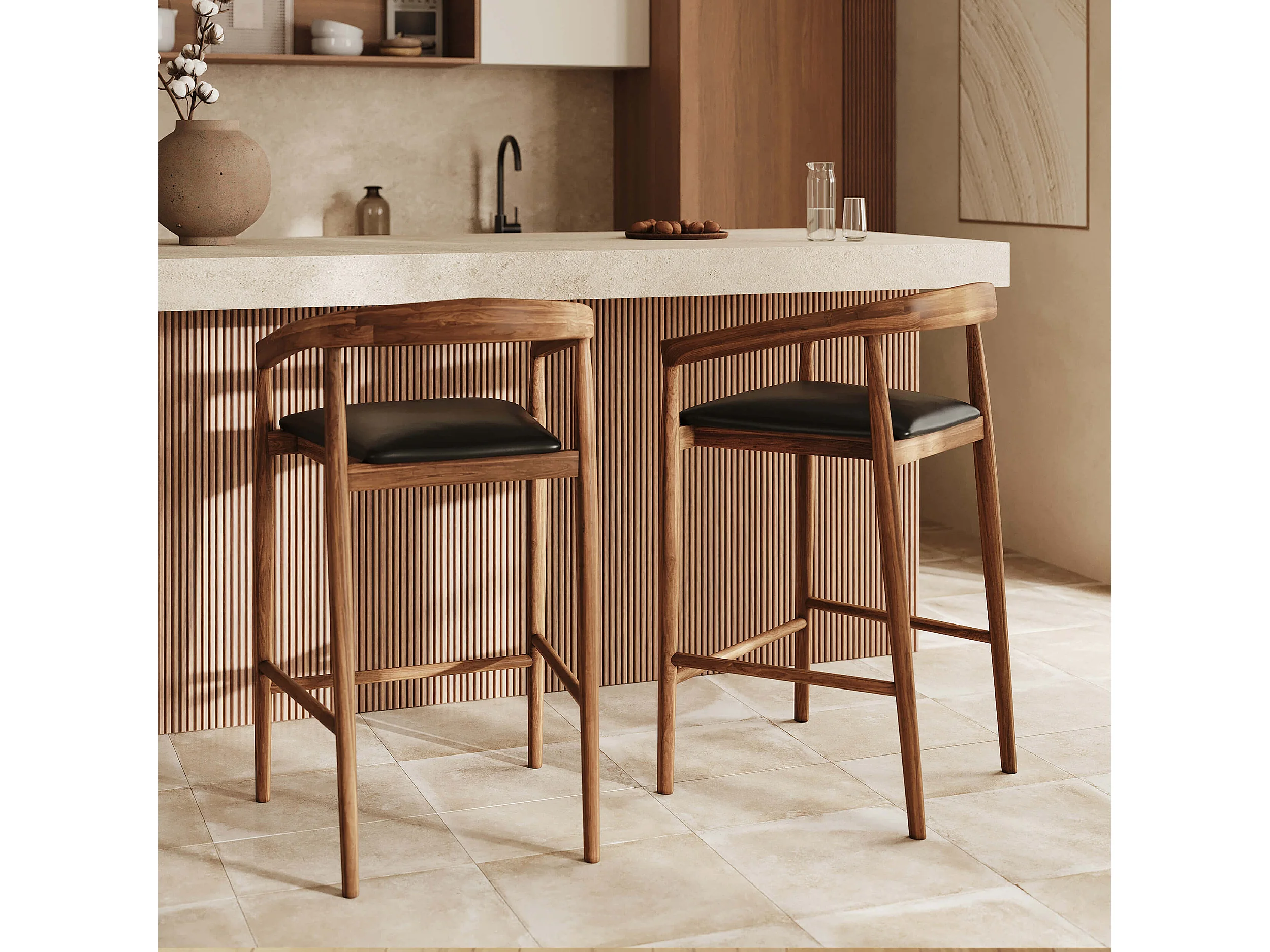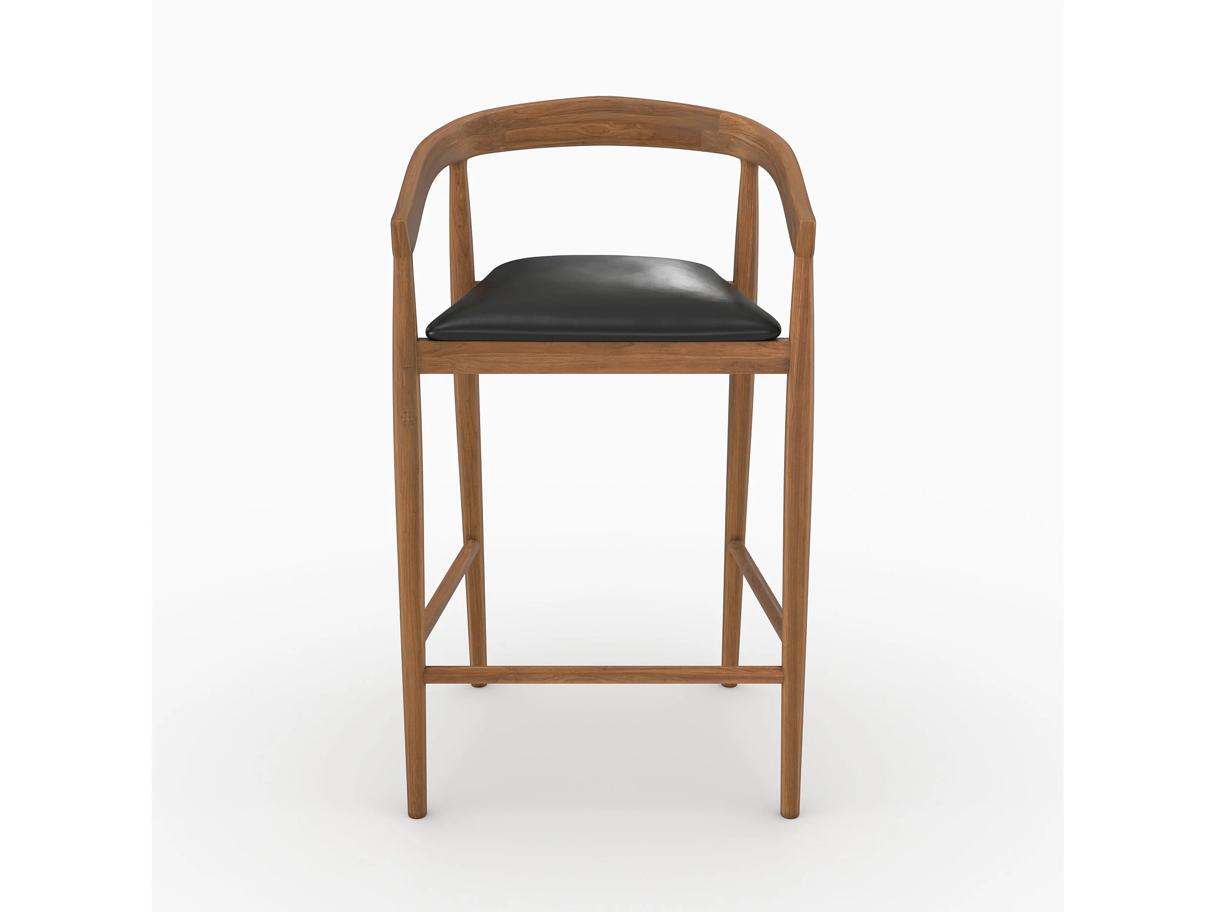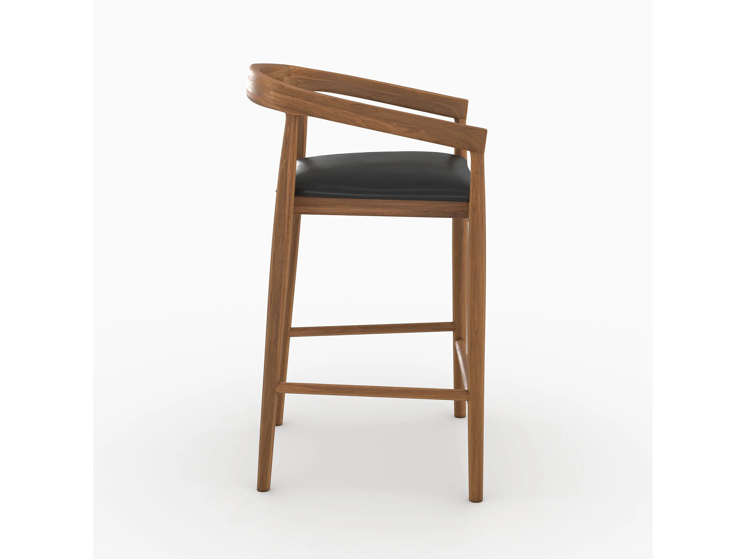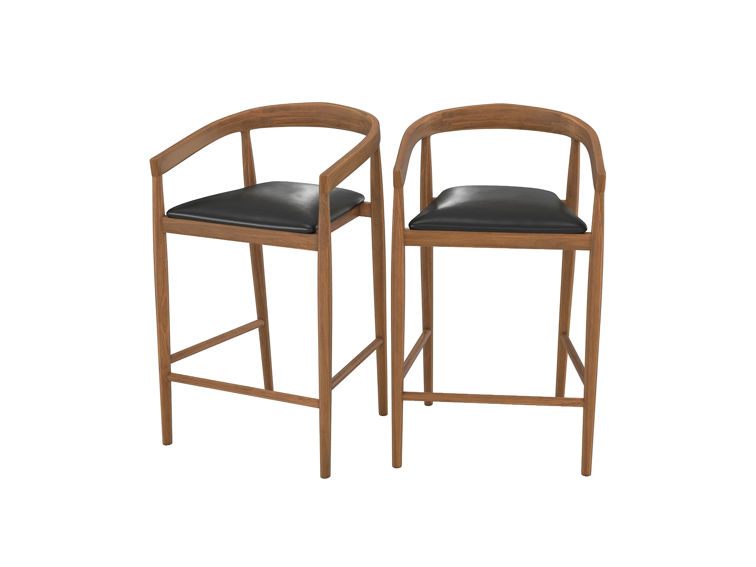 Set of 2 bar stools, 77 cm, in varnished teak with black leather seats - Bali