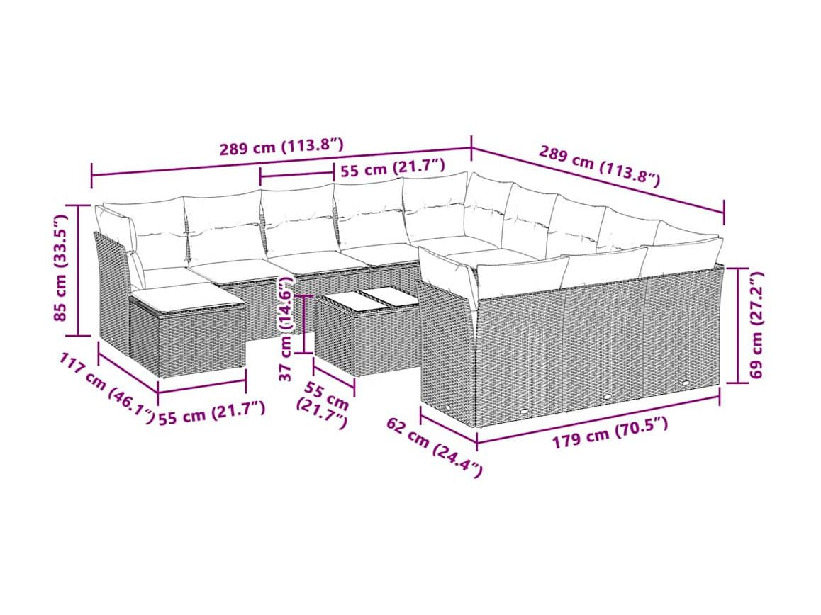 Set de sofás de jardín y cojines 12 pzas ratán sintético gris