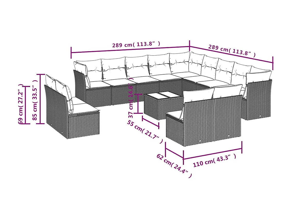Set sofás de jardín con cojines 13 piezas ratán sintético gris