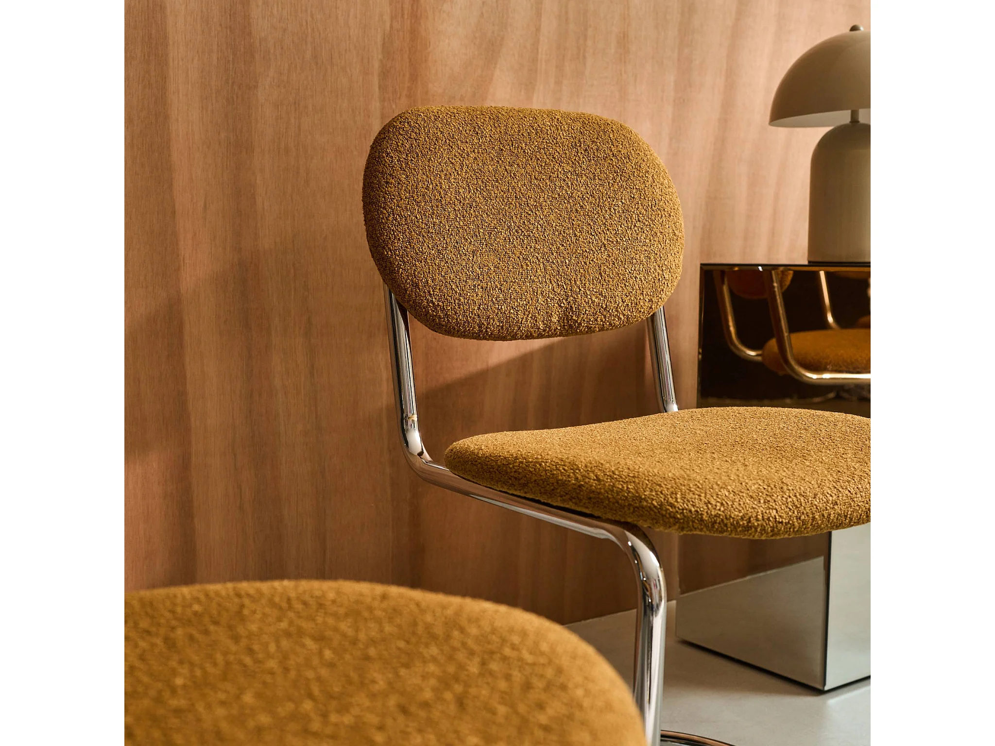 Silla cantilever redondeada de metal, borreguito texturizado y patas