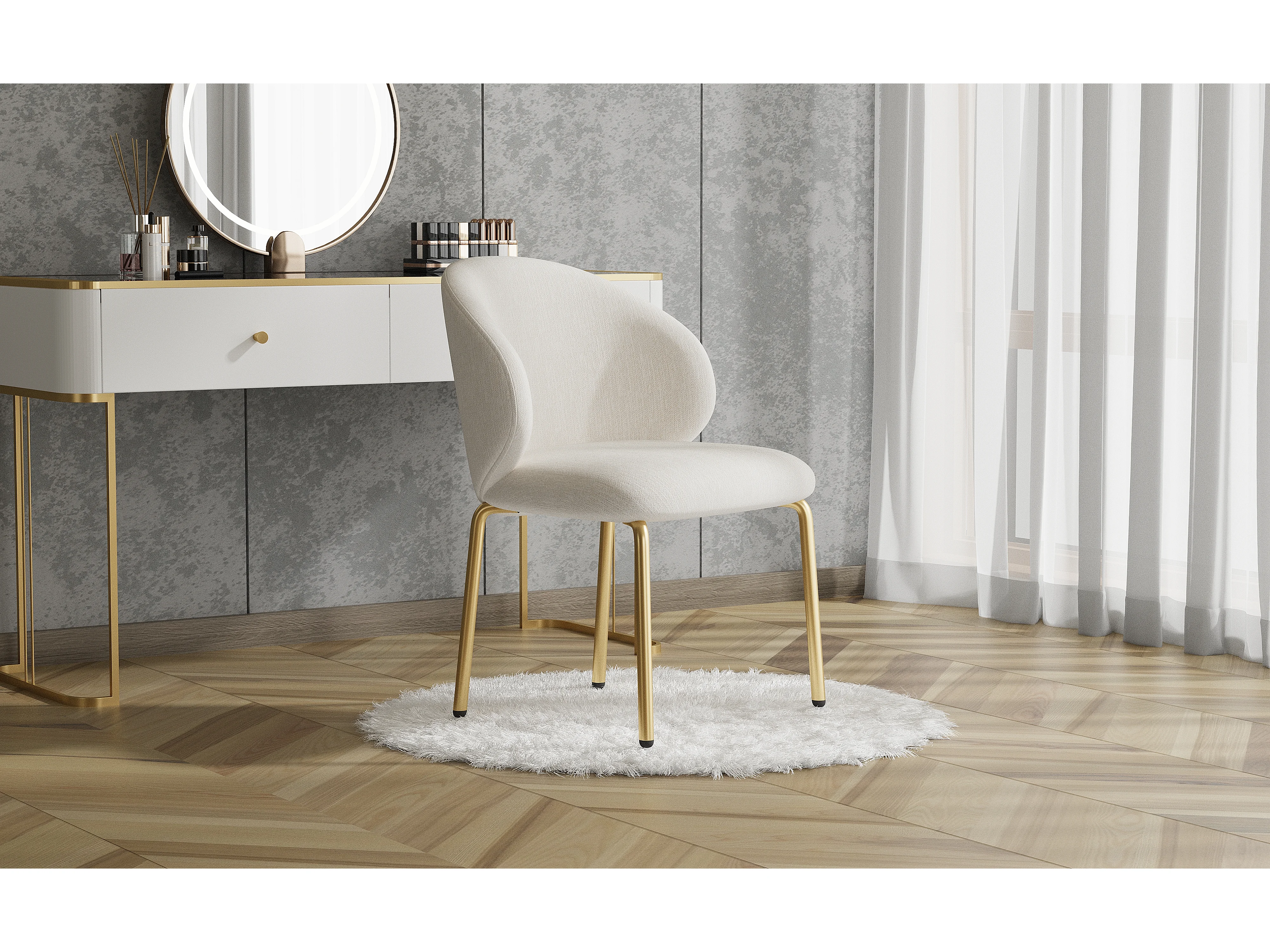 Silla de chenilla beige con patas de metal dorado