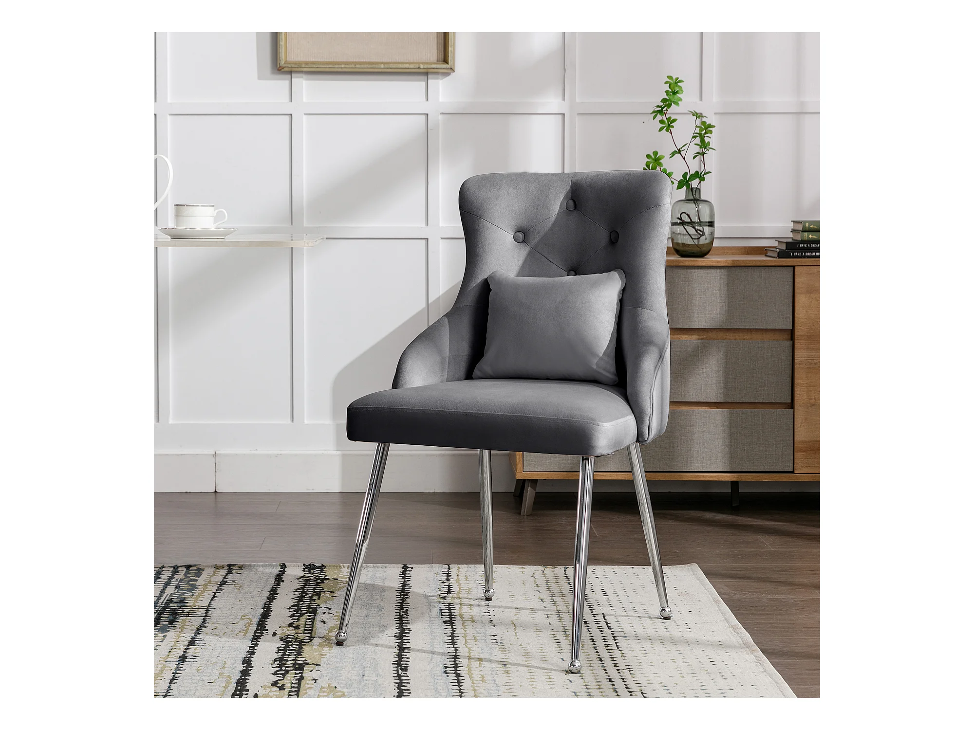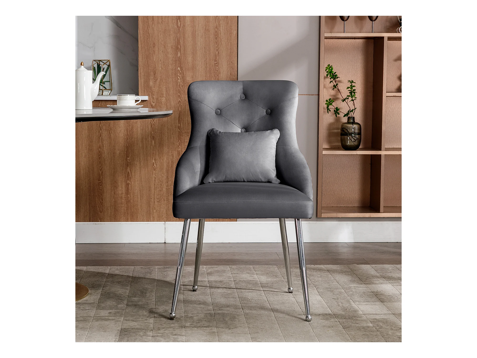Silla de comedor de terciopelo gris con cojín lumbar y diseño moderno y patas de metal.