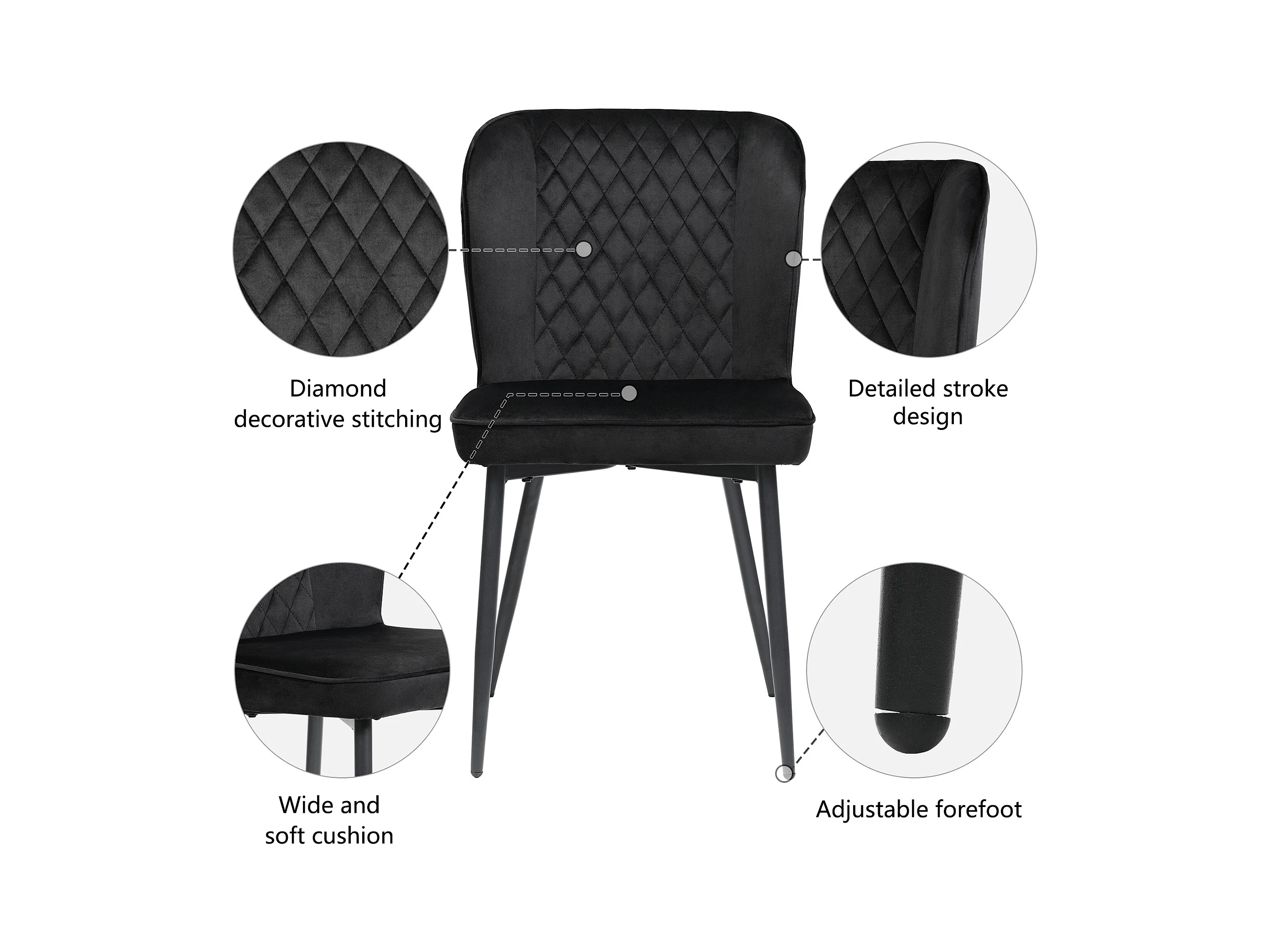 Silla de comedor moderna de terciopelo negro con patas de metal, juego de 6 (47x43x86 cm)