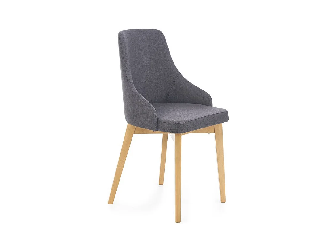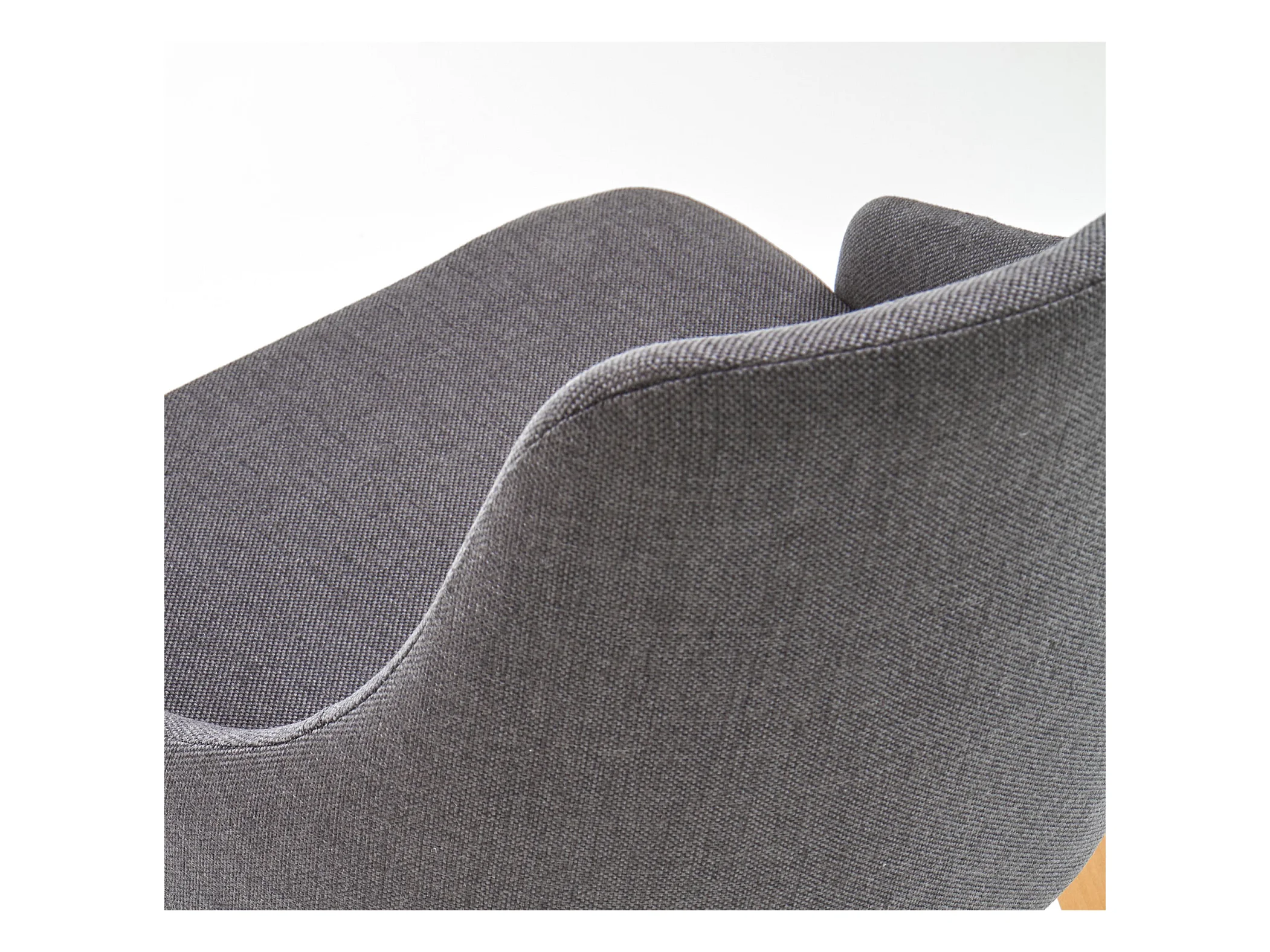Silla de comedor Aura patas de roble, con reposabrazos y retorno giratorio color gris claro.