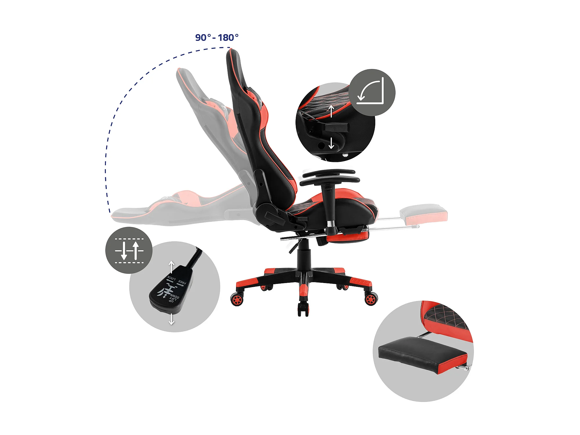 Silla gaming ergonómica con función balancín, acero, negro y rojo (67x75x106-112 cm)