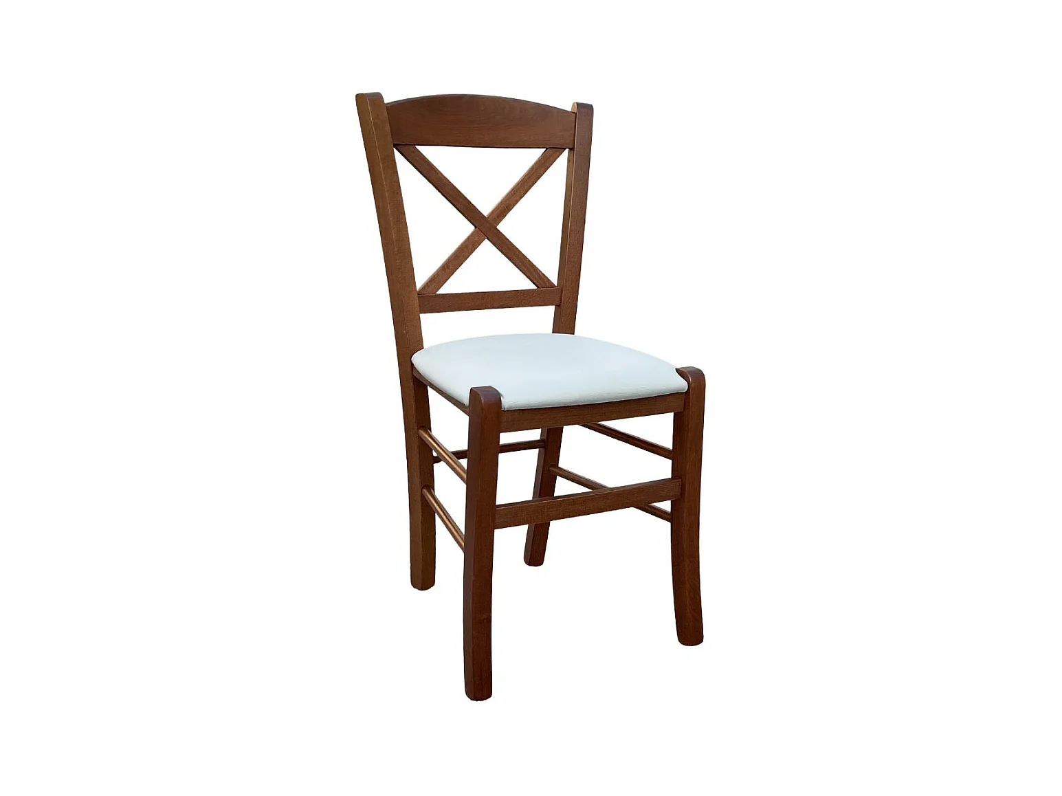 Silla rústica de madera en nogal claro con asiento de piel sintética beige