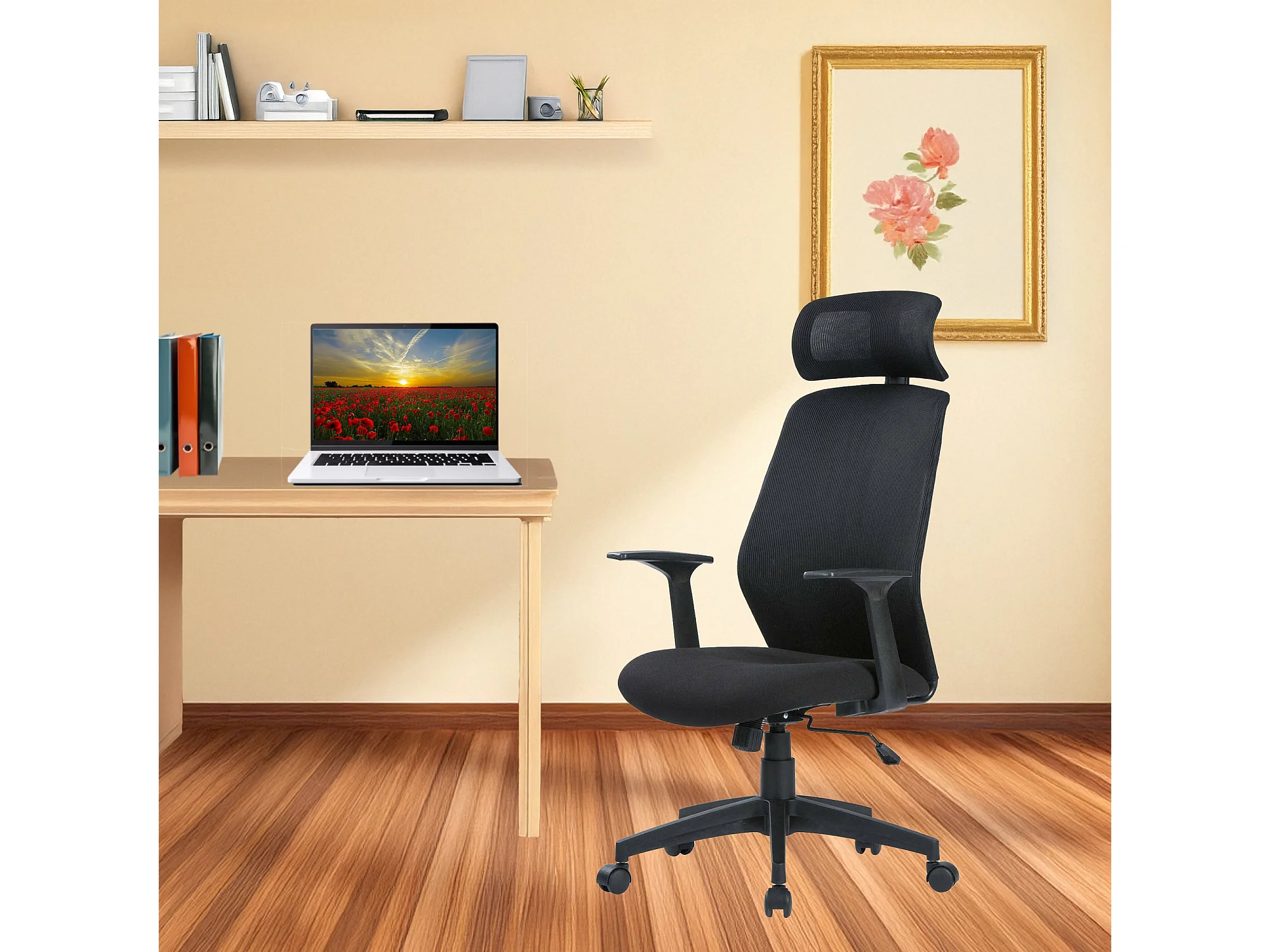 Silla de oficina Brisbane, Sillón presidencial con reposabrazos y reposacabezas, Silla de oficina ergonómica, 63x62h117/126 cm, Negro