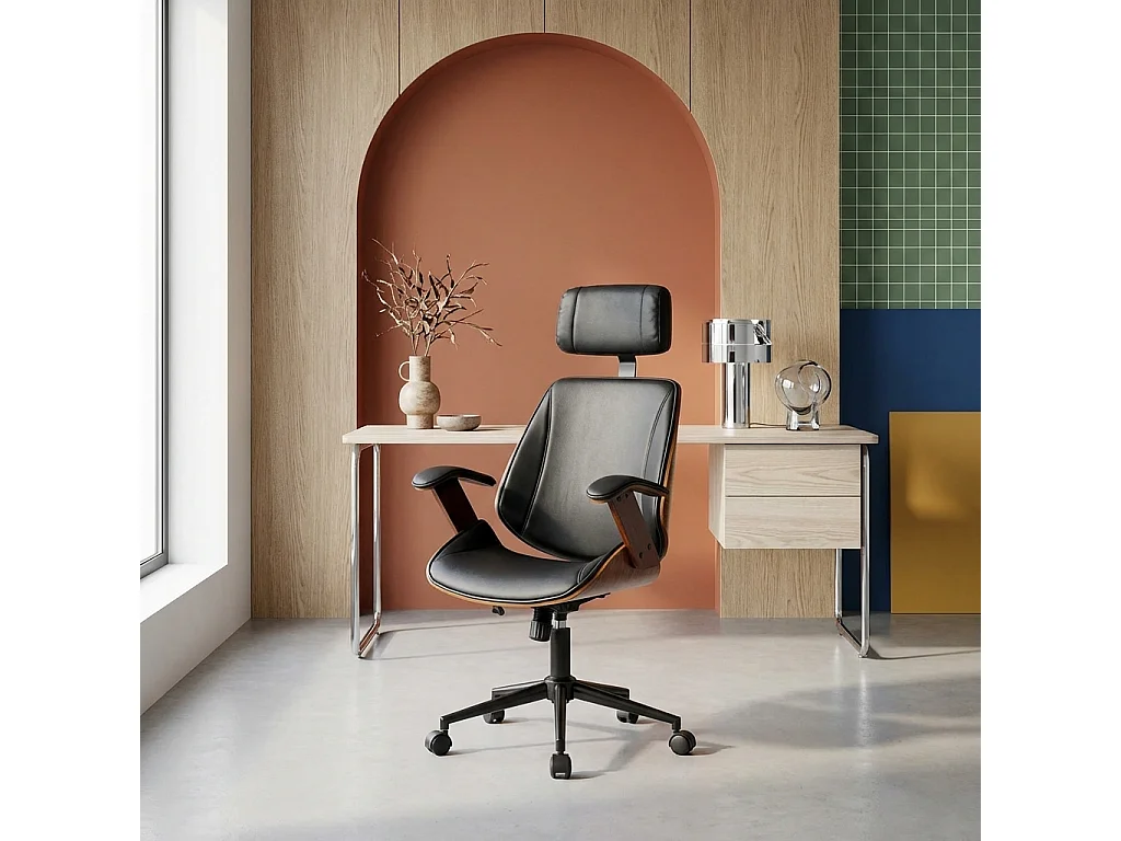 Silla de oficina con ruedas, madera curvada y acabado en polipiel
