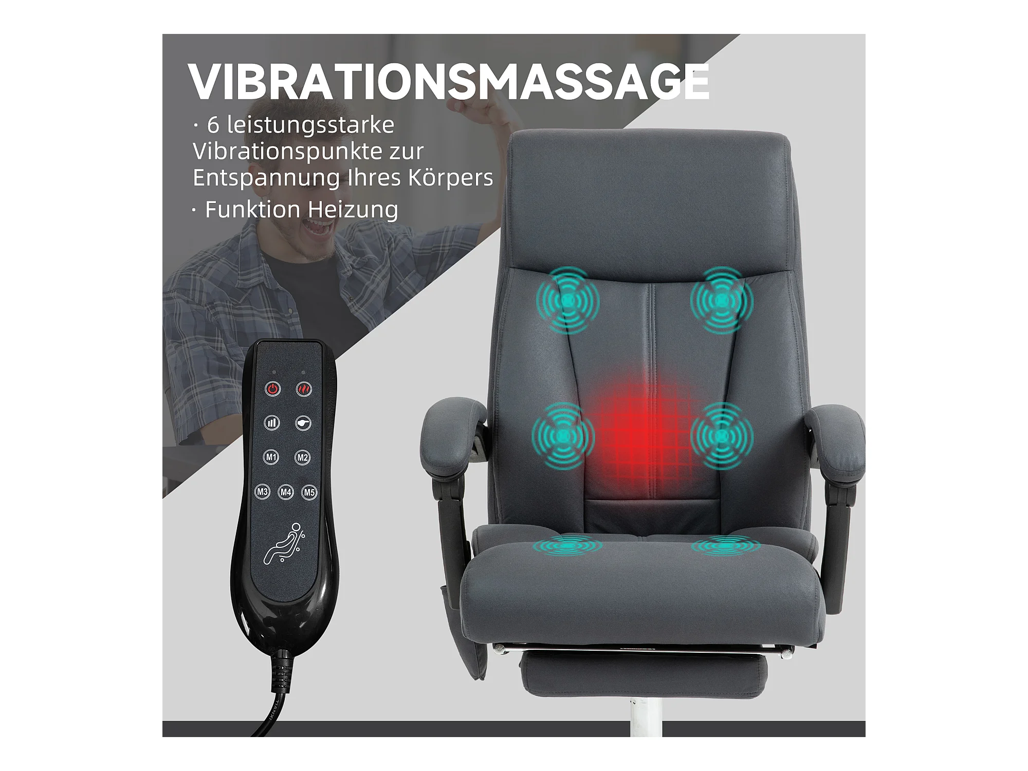 Silla de oficina ergonómica con masaje calefactado y reposapiés en tela gris