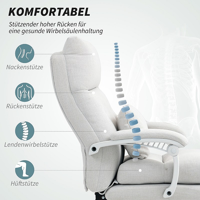 Silla de oficina ergonómica con respaldo alto, soporte lumbar, lino, reclinable, color crema
