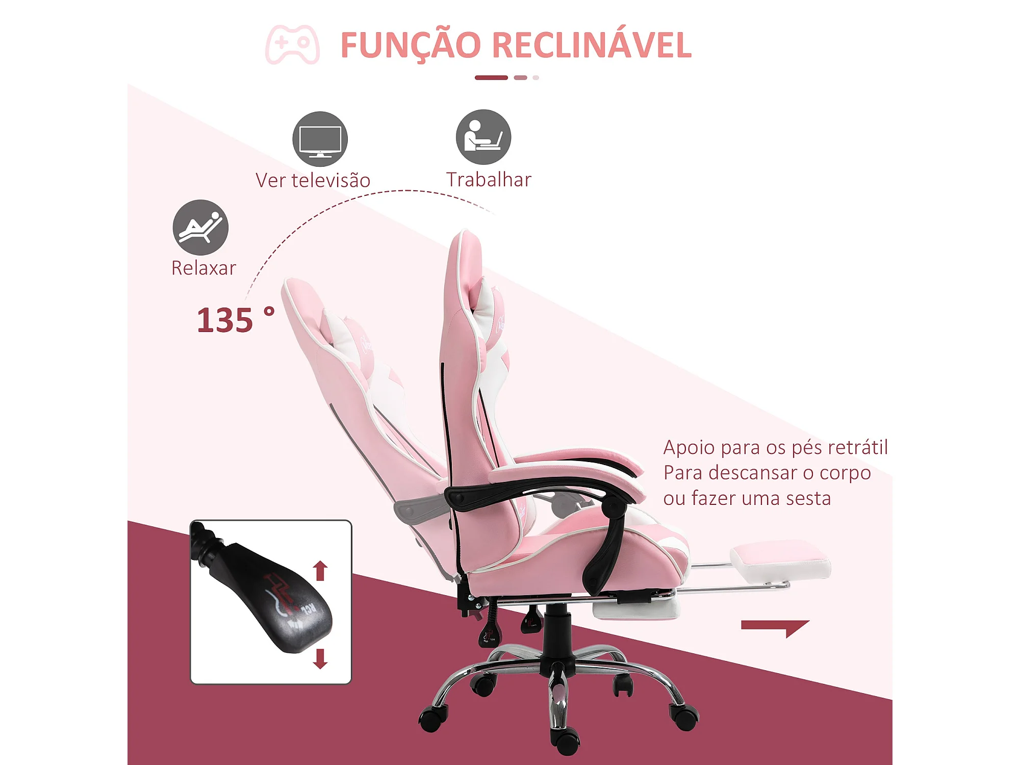 Silla gaming con reposapiés cuero sintético rosa y blanco ES550662