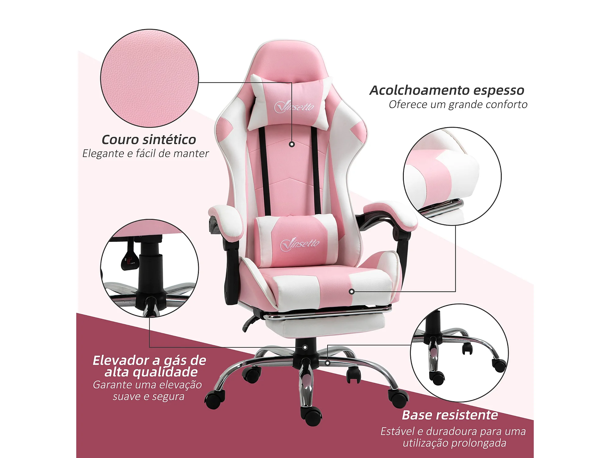 Silla gaming Candy Vinsetto cojín lumbar rosa 119-127x64x67 cm