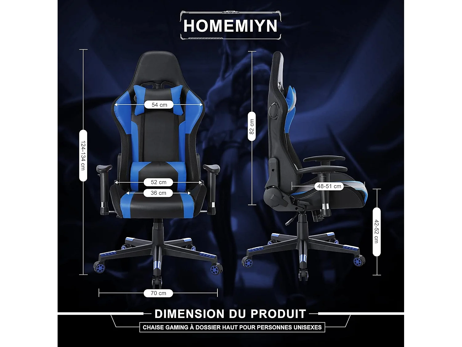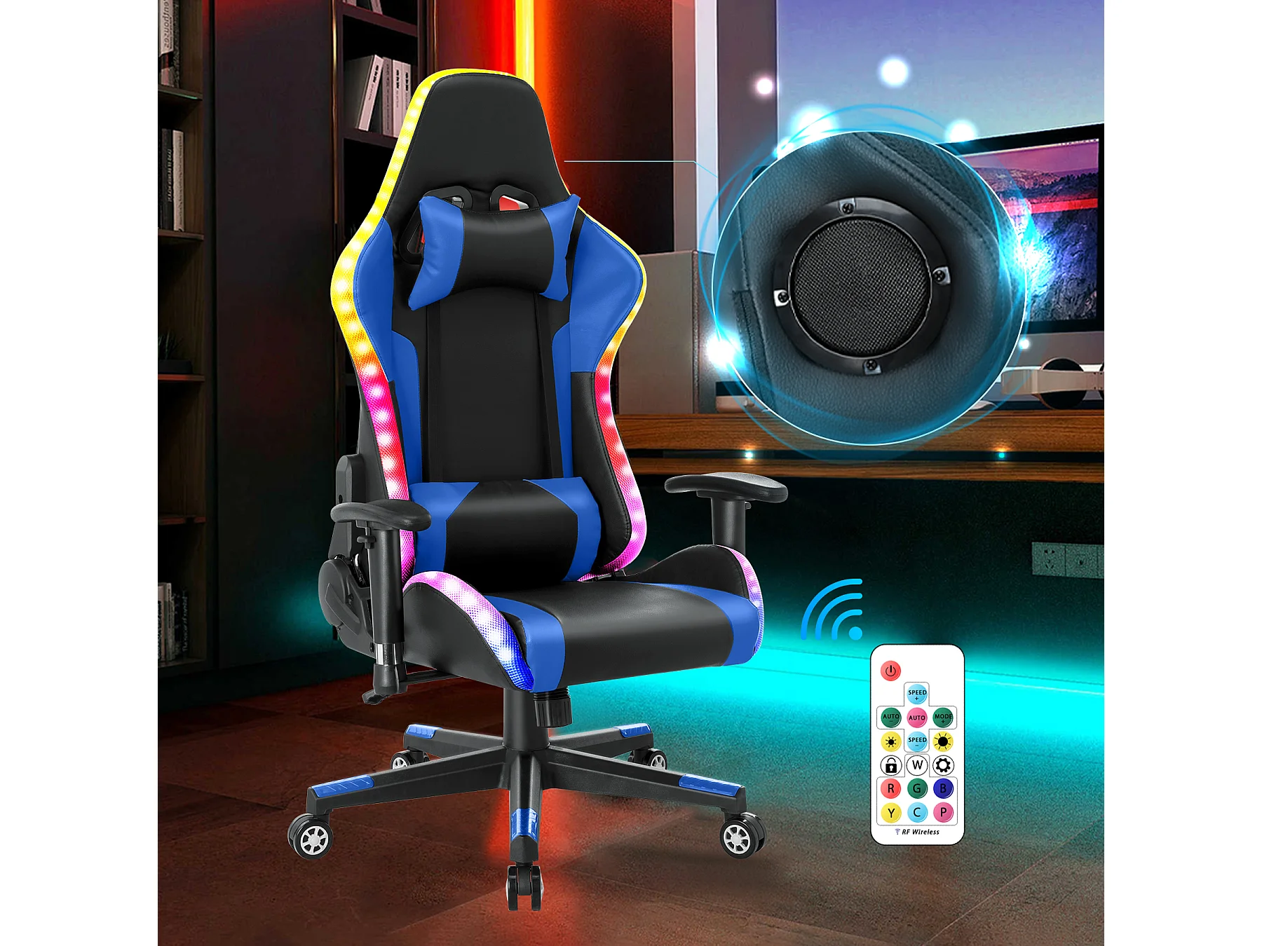 Silla gaming con luces LED RGB y altavoces, estilo racing, para oficina, de piel sintética azul