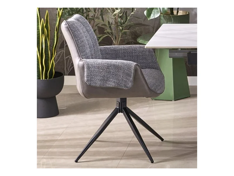 Silla giratoria de diseño gris, tela y ecopiel, base de metal negro LUDMILA