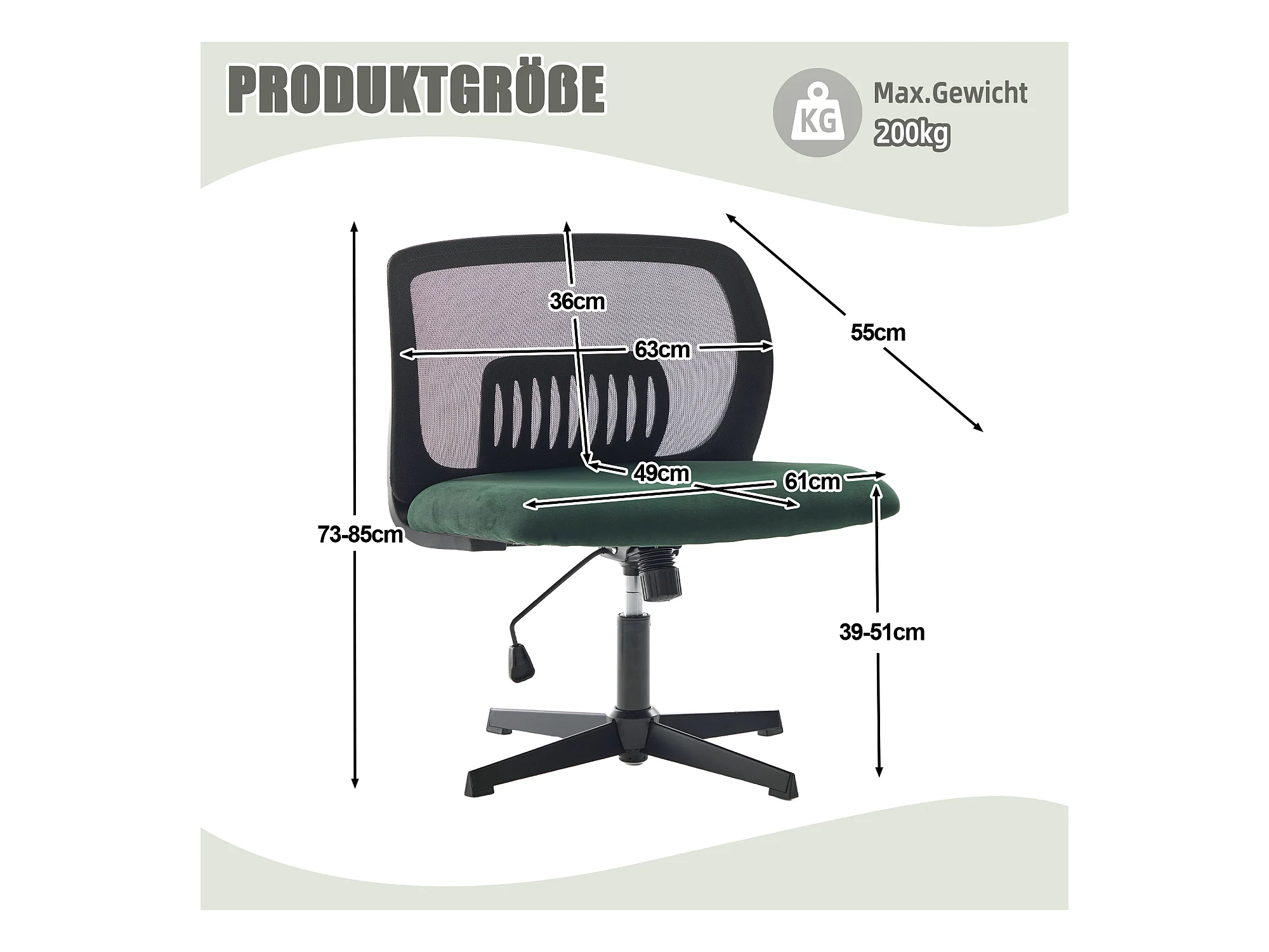 Silla de oficina sin brazos, silla de lectura, terciopelo, verde, altura ajustable (61 x 55 x 73-85 cm)