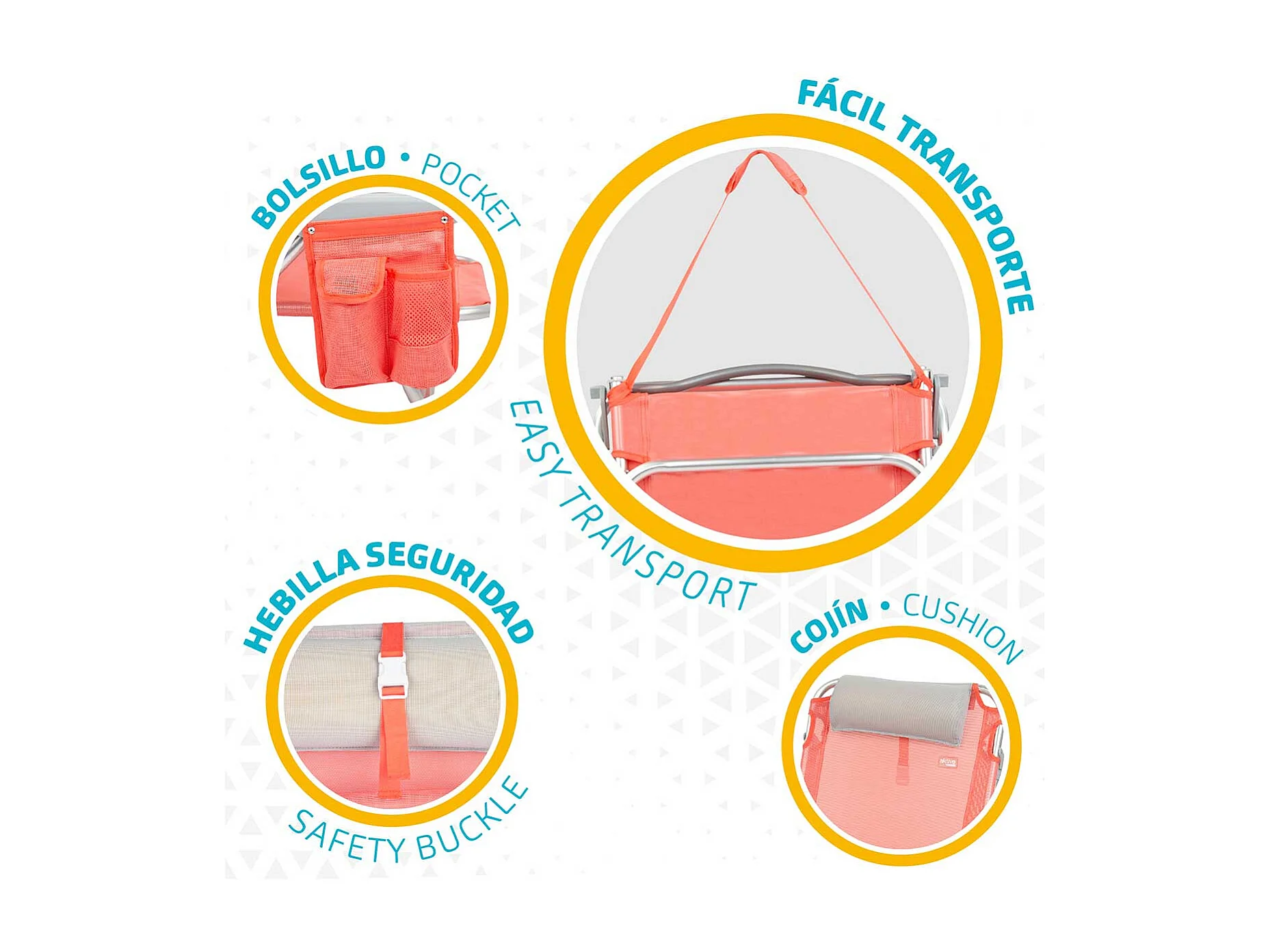 Silla plegable Aktive 4 posiciones con cojín + bolsillo + asa salmón 76x64x45 cm