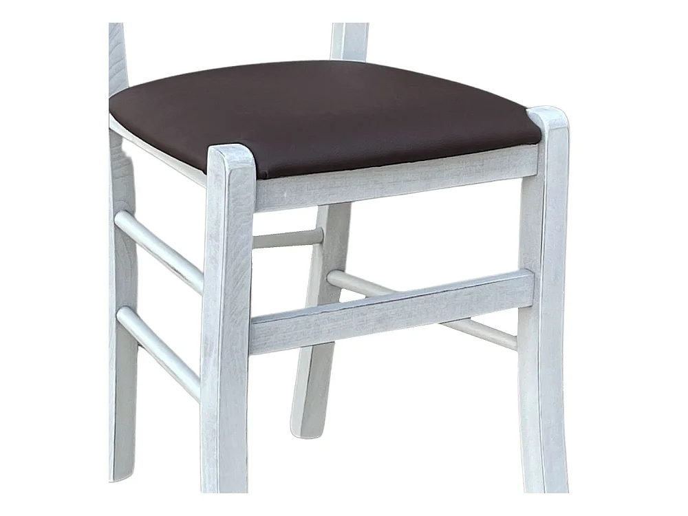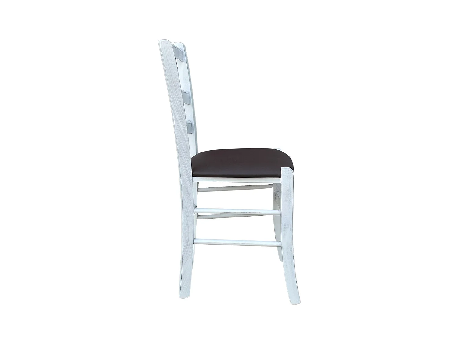 Silla de madera de estilo rústico de Venecia de color blanco con asiento de piel sintética de color marrón