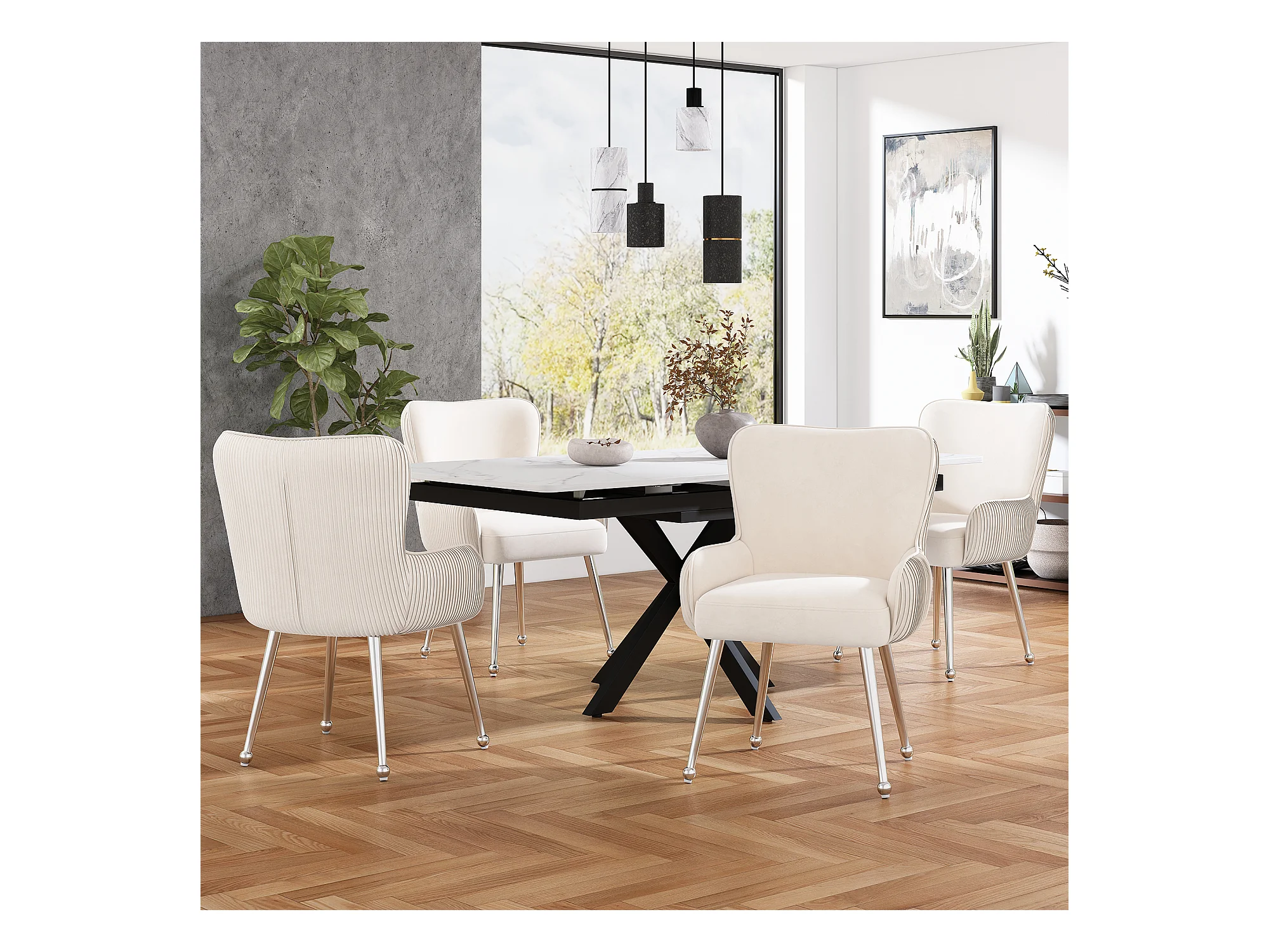 Silla giratoria de terciopelo beige con patas de metal plateado para sala de estar o dormitorio de diseño, juego de 6