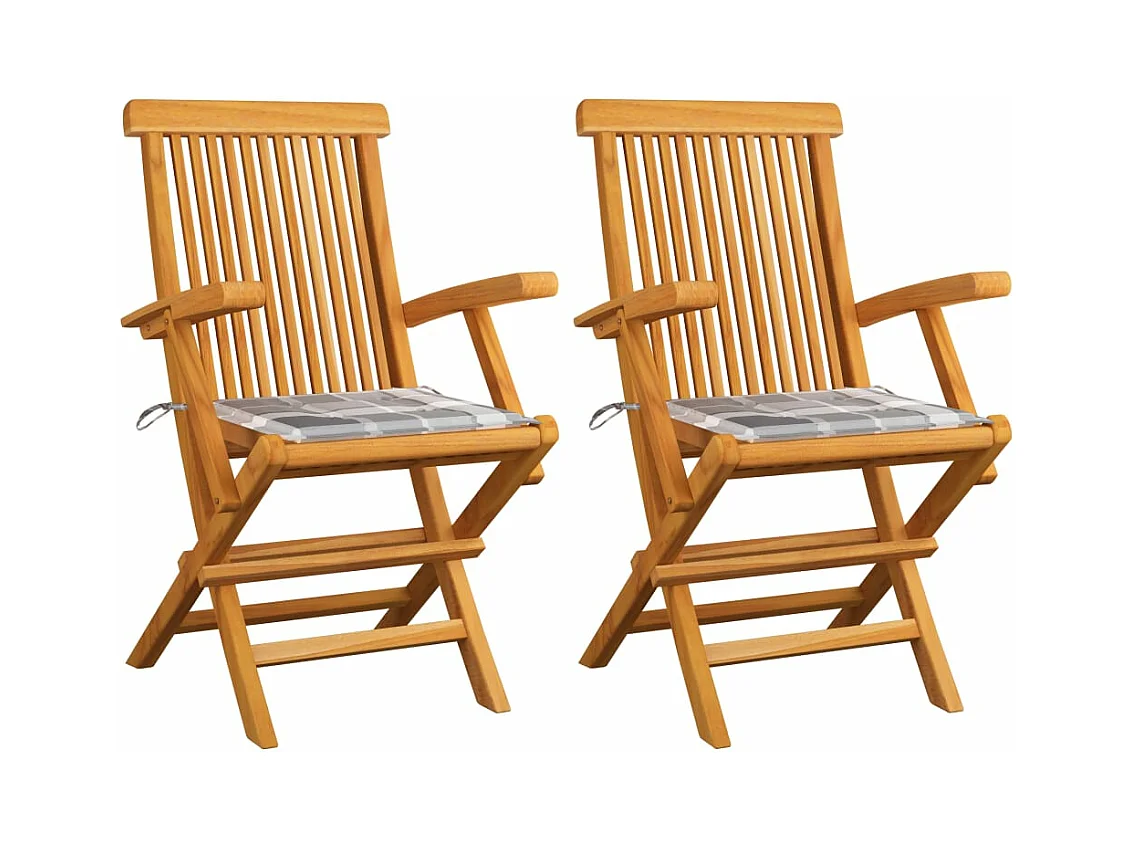 Sillas de jardín 2 uds madera teca con cojines a cuadros grises