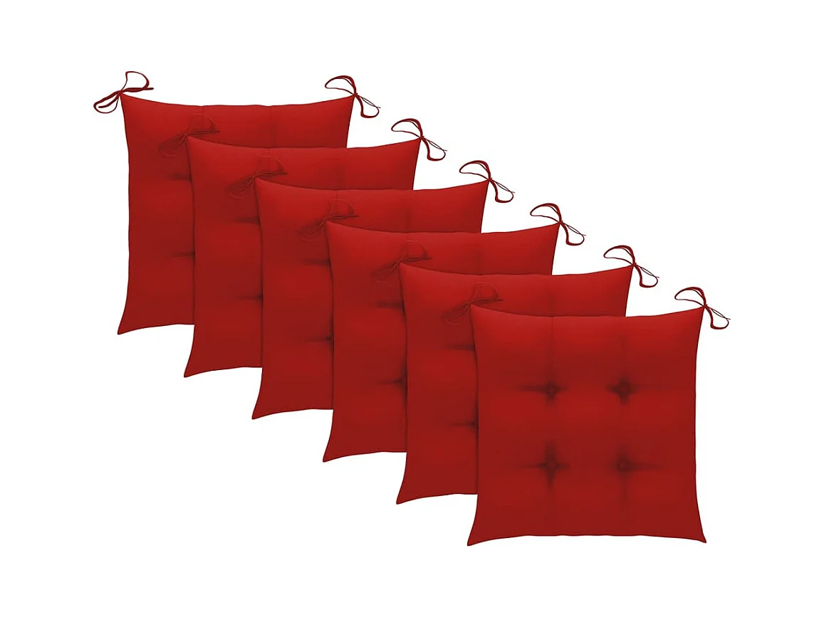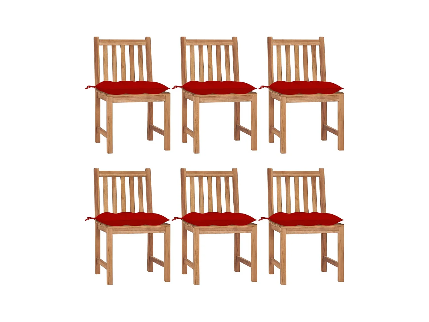 Juego de 6 sillas de jardín con cojines rojos. Madera maciza de teca.