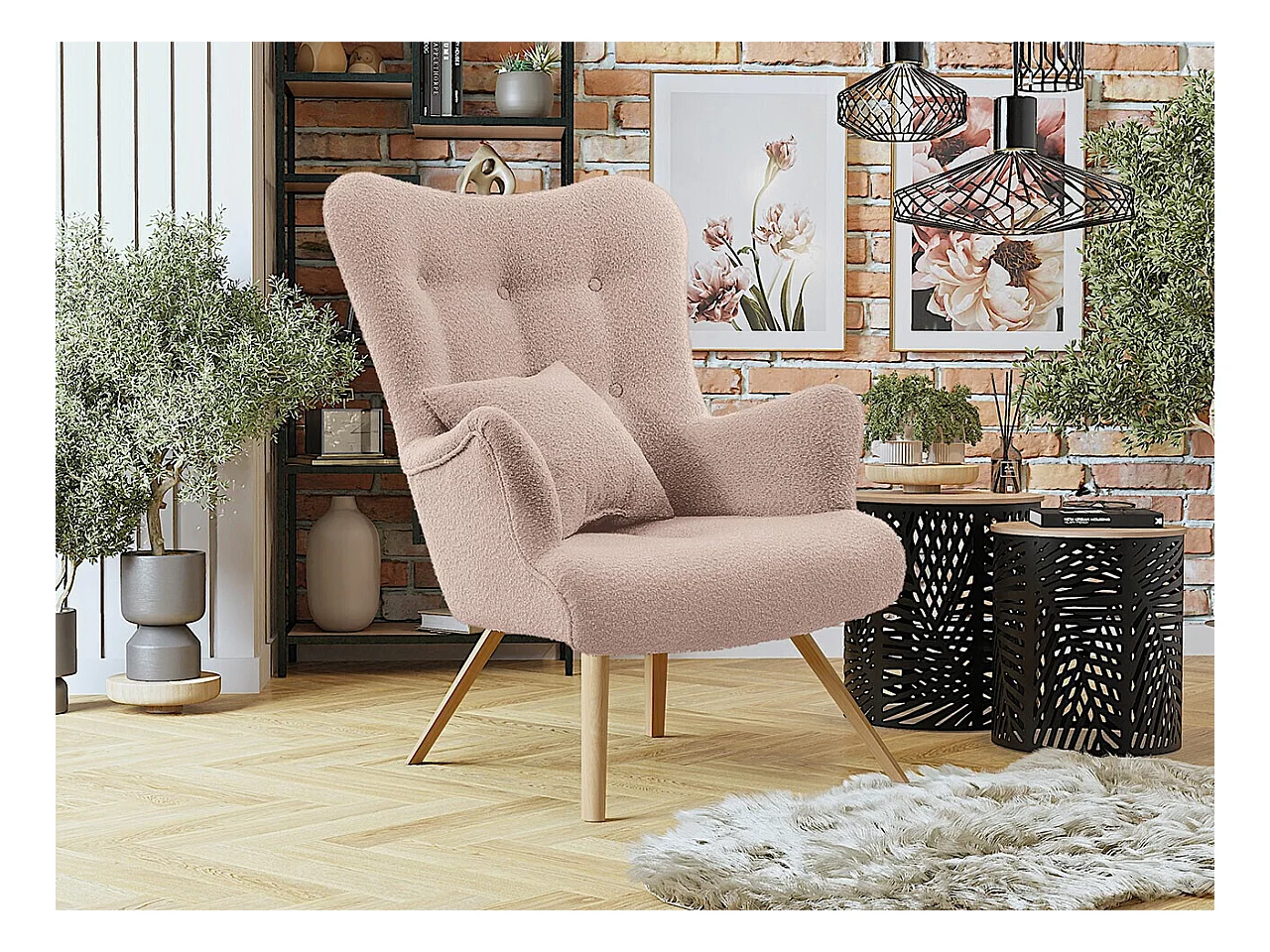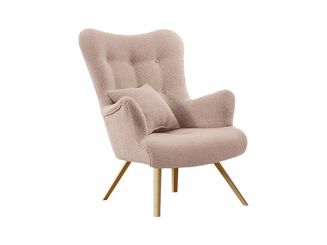Sillón moderno simple en terciopelo Teddy (con cojín),Sillón con cojín extragrueso,Sillón sofá simple,Patas de madera maciza,Rosa