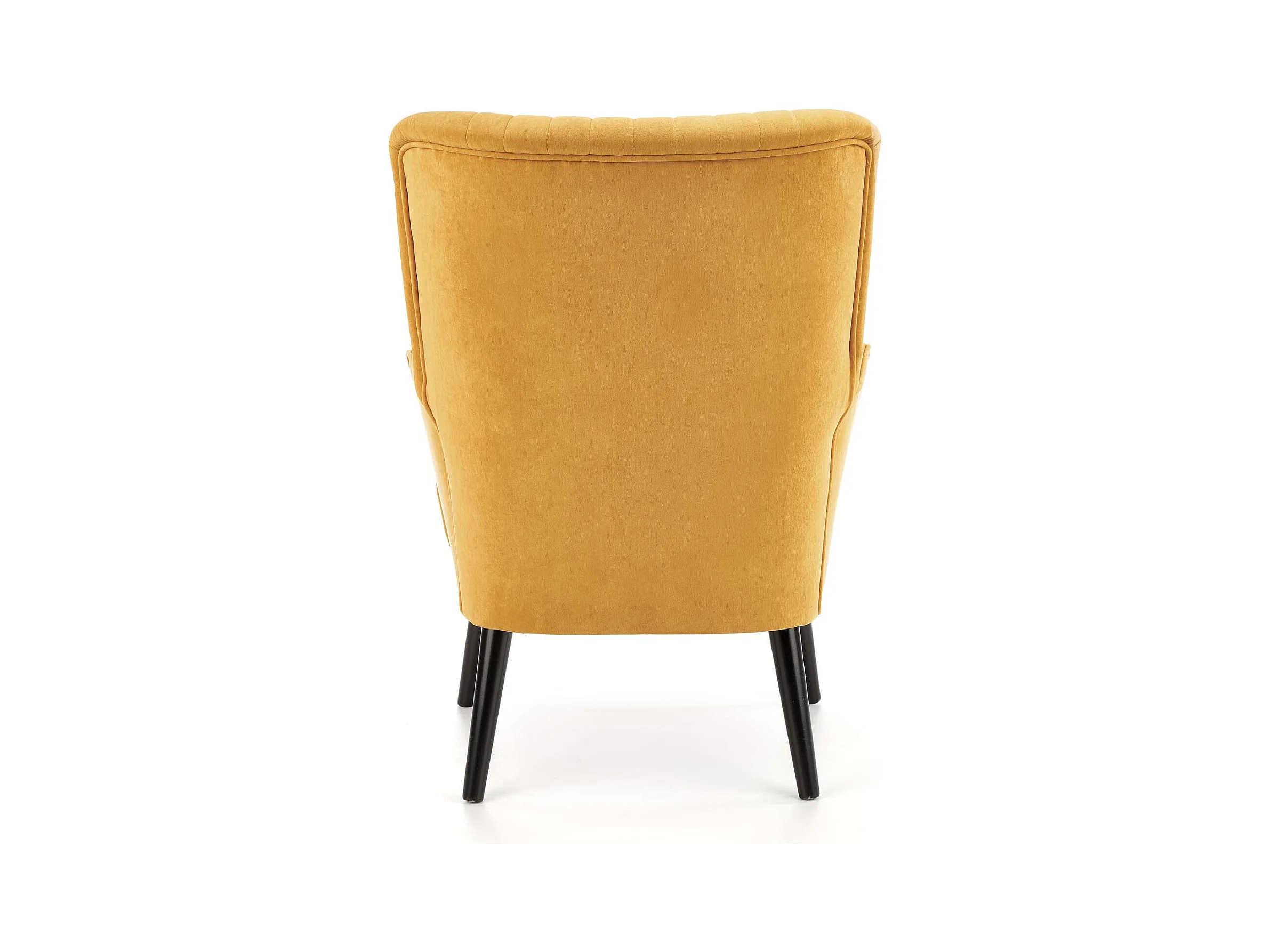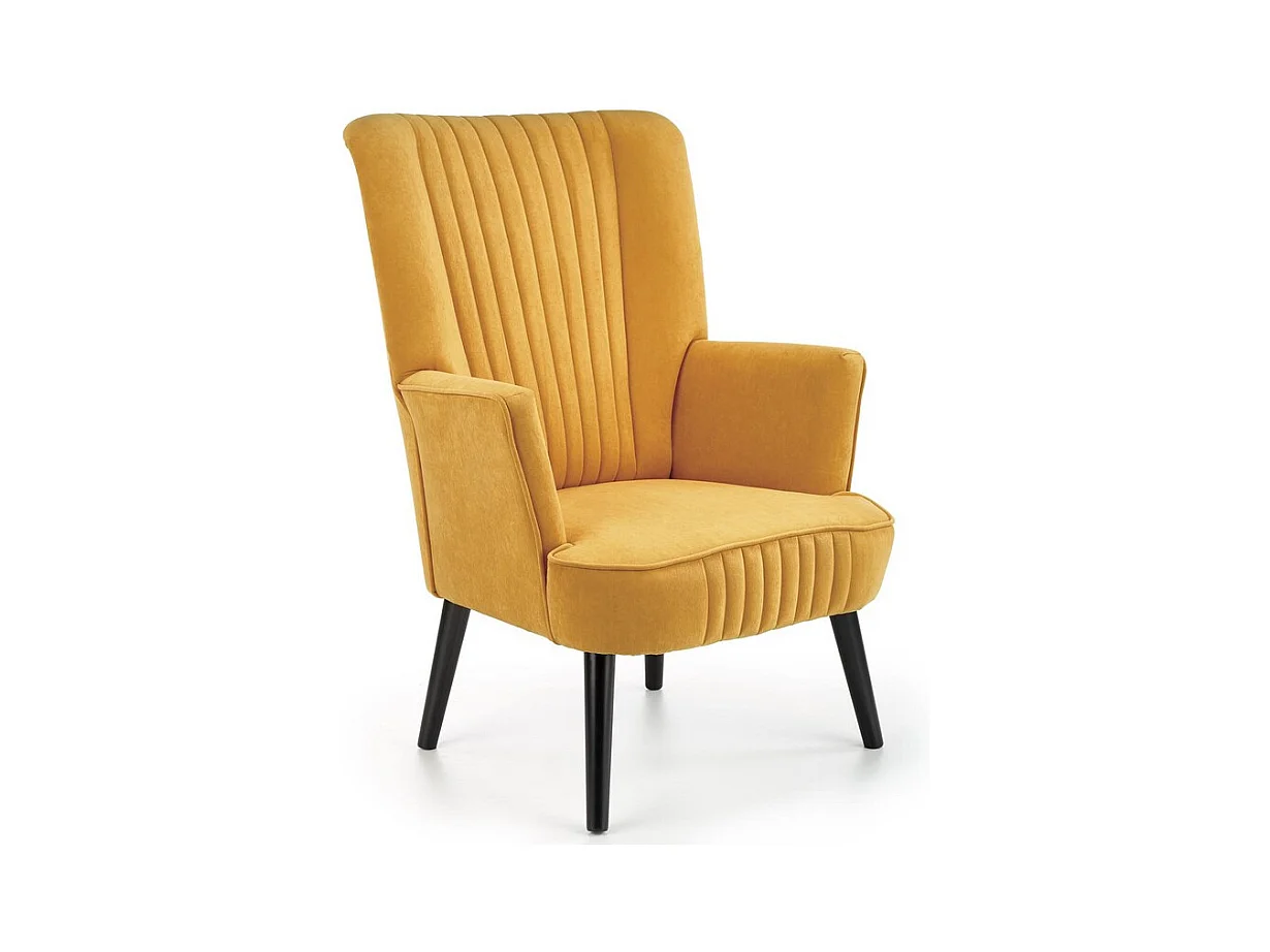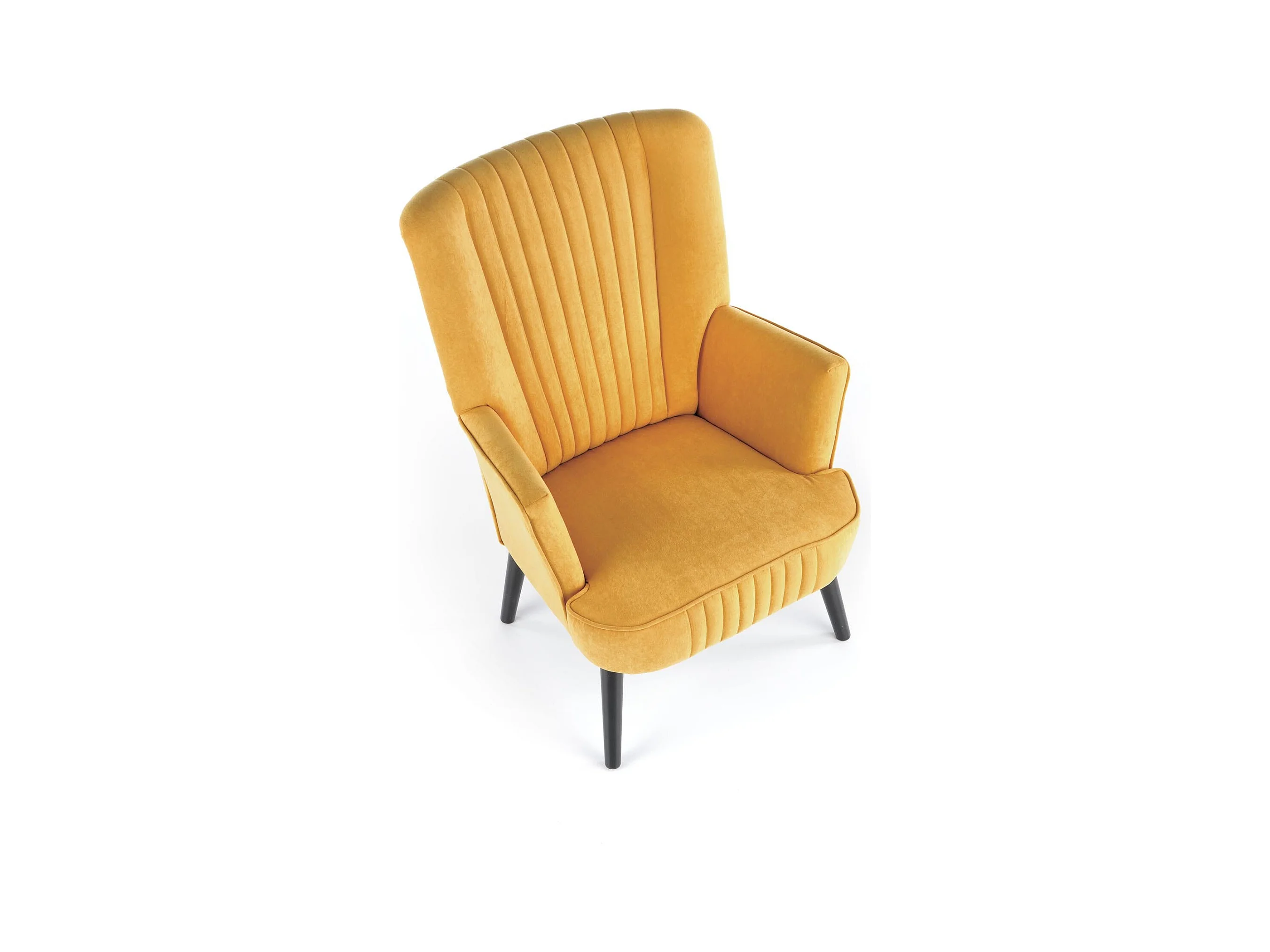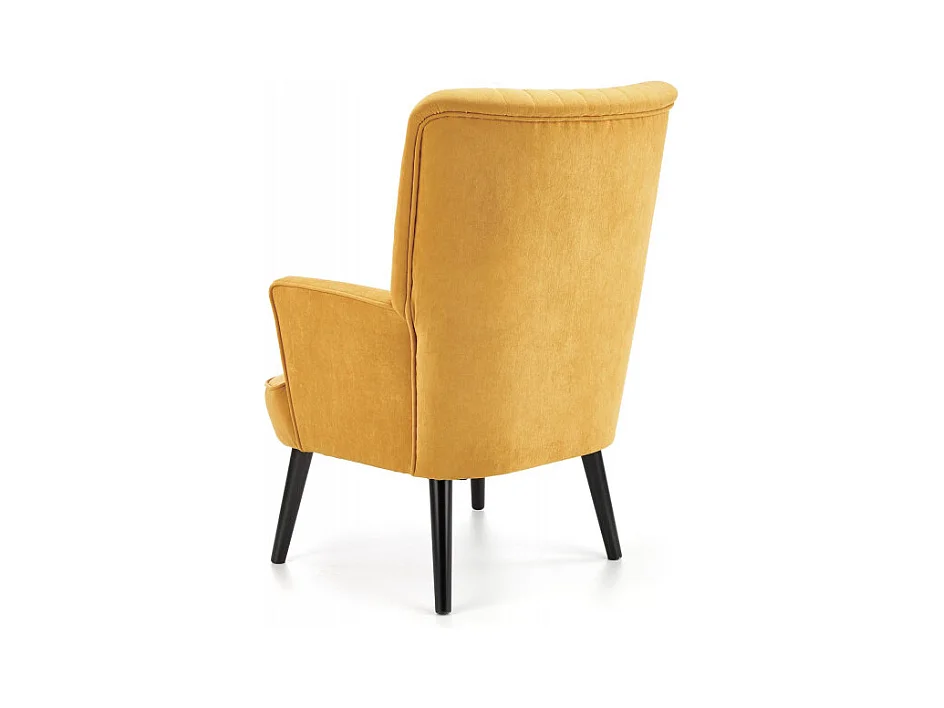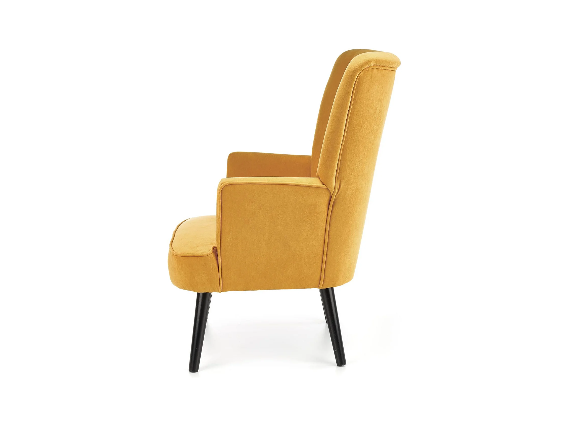 Sillón contemporáneo de terciopelo amarillo mostaza con respaldo alto y patas de madera maciza negra CYRUS