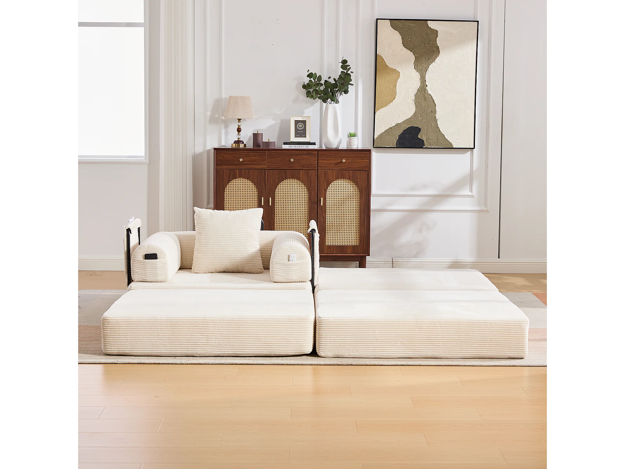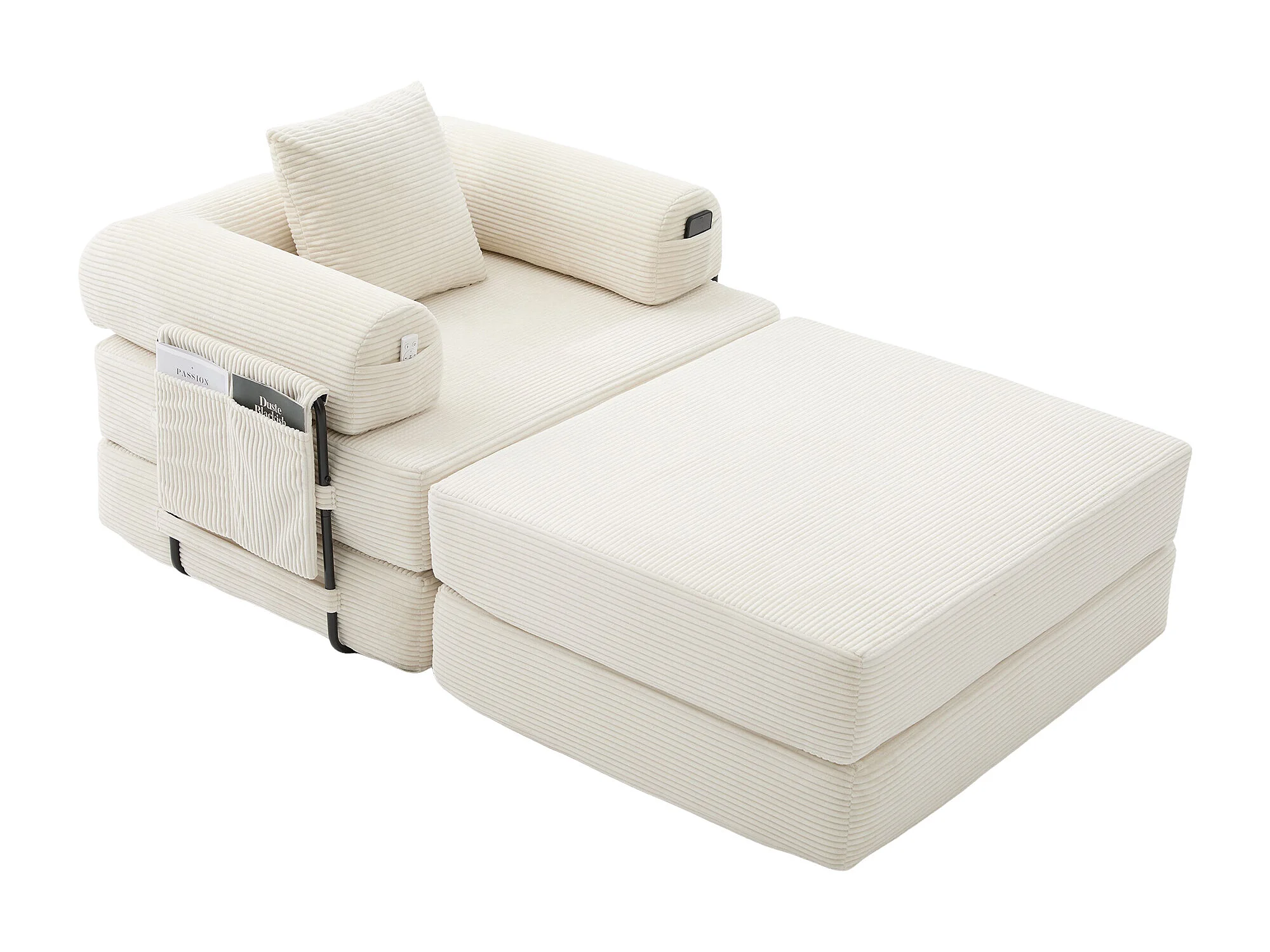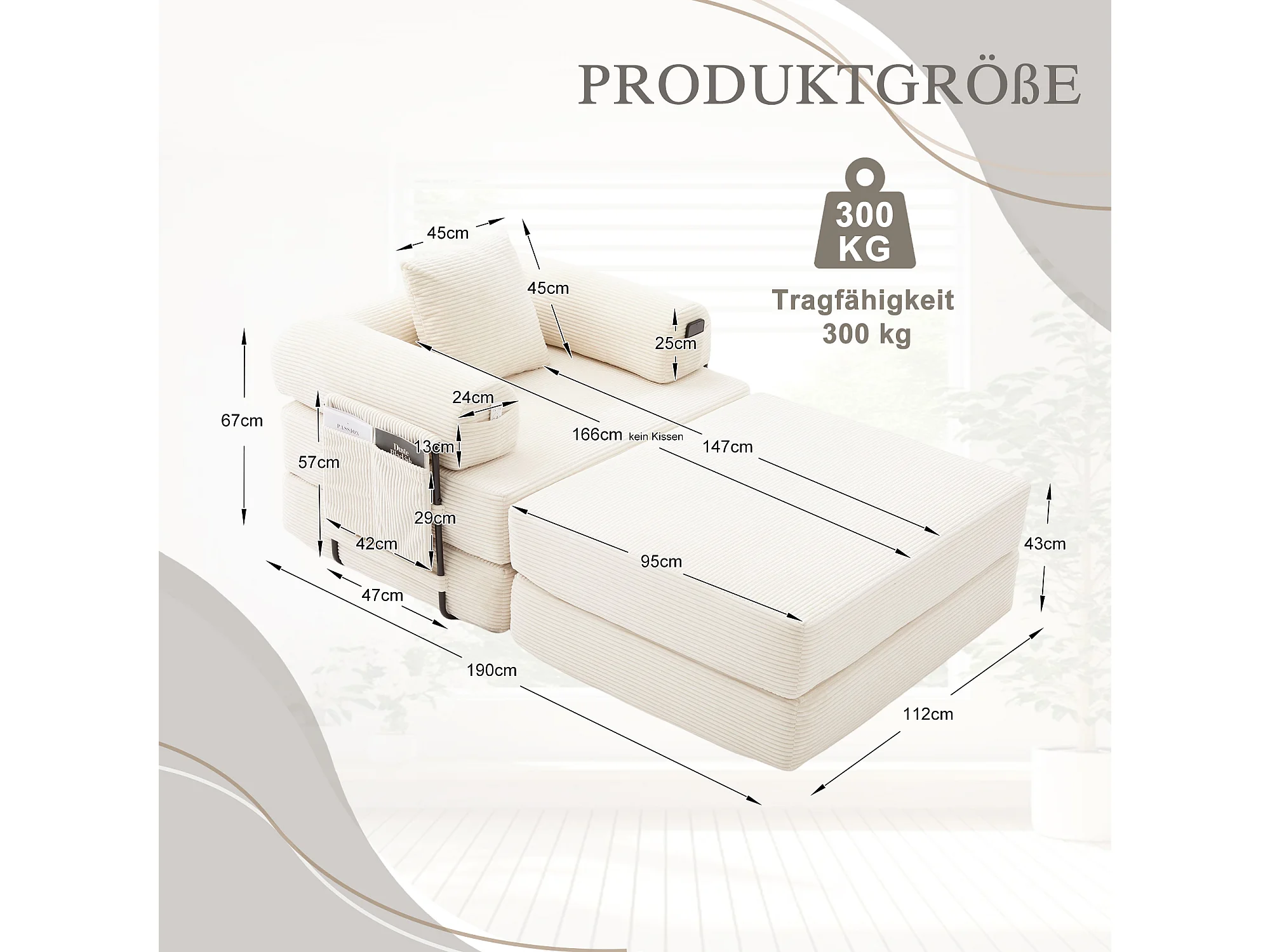 Sillón convertible de pana - 190 x 112 x 67 cm - con cojines + bolsillo - infinitamente modular - beige