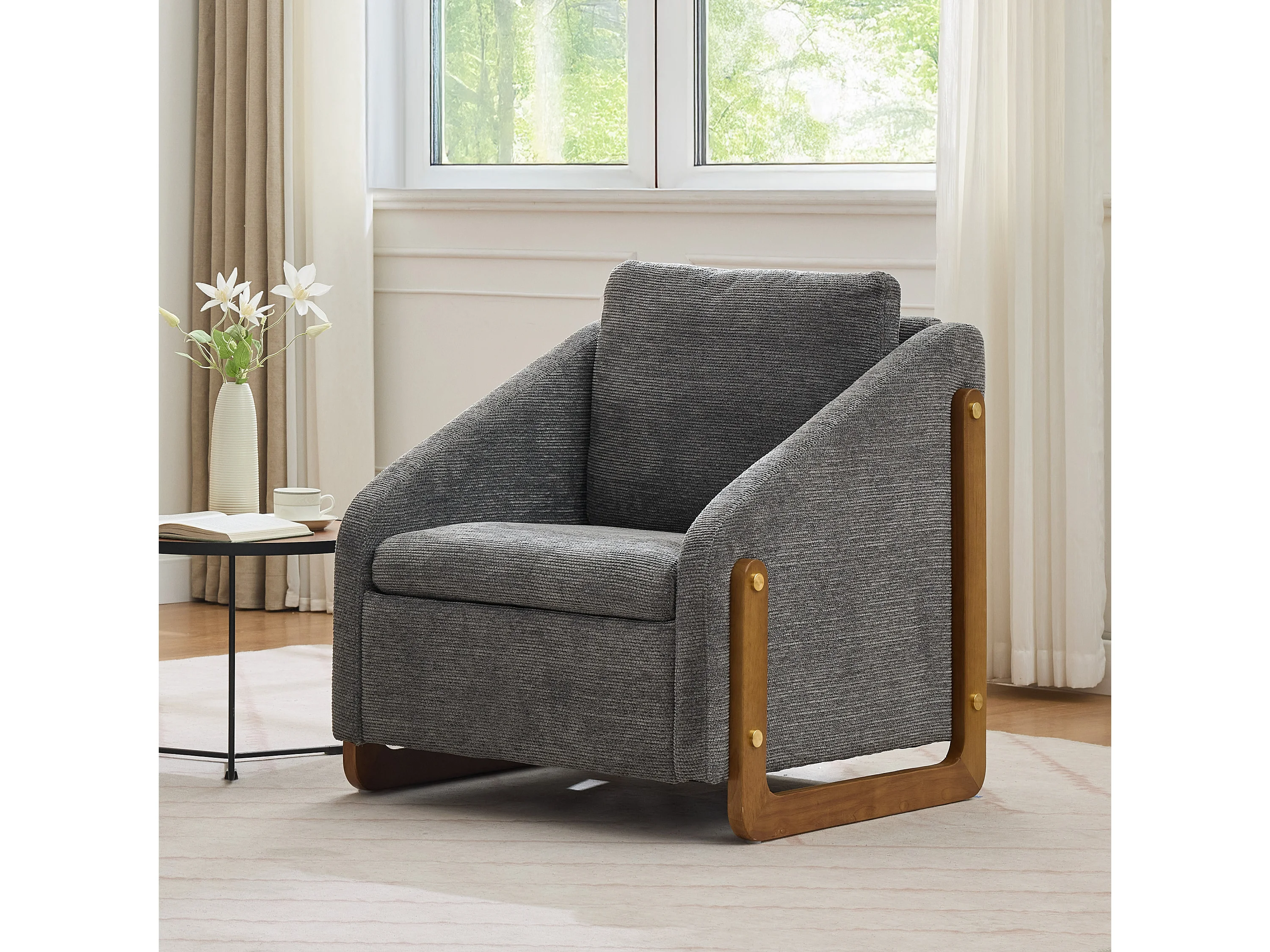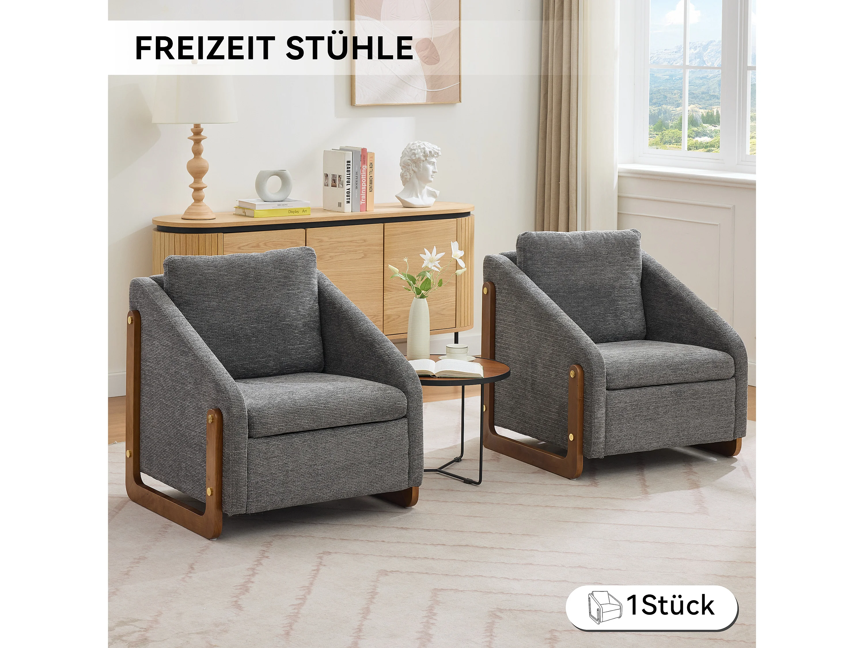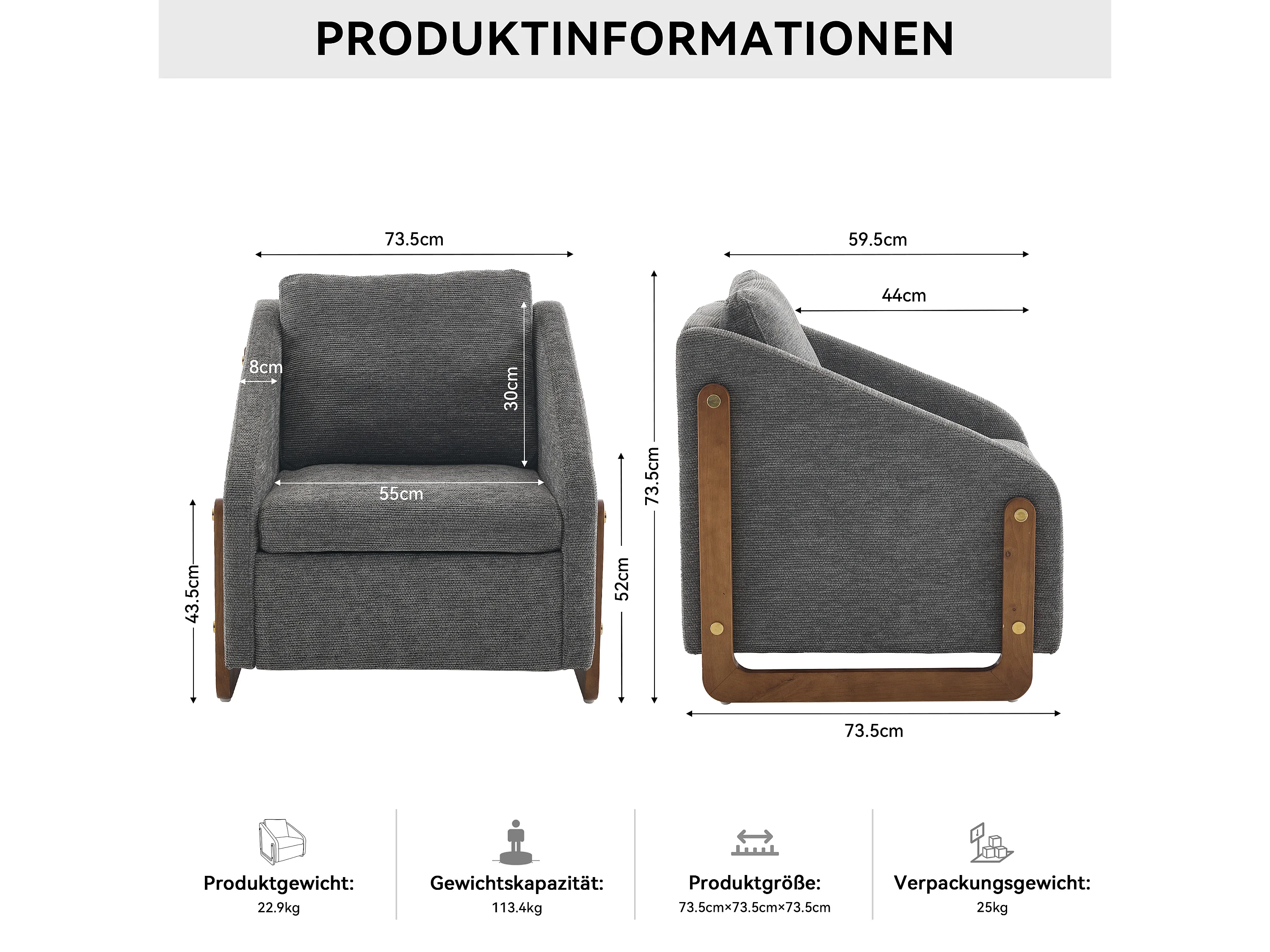 Sillón de chenilla gris para salón o dormitorio, con reposabrazos de madera, 73,5 x 73,5 x 73,5 cm
