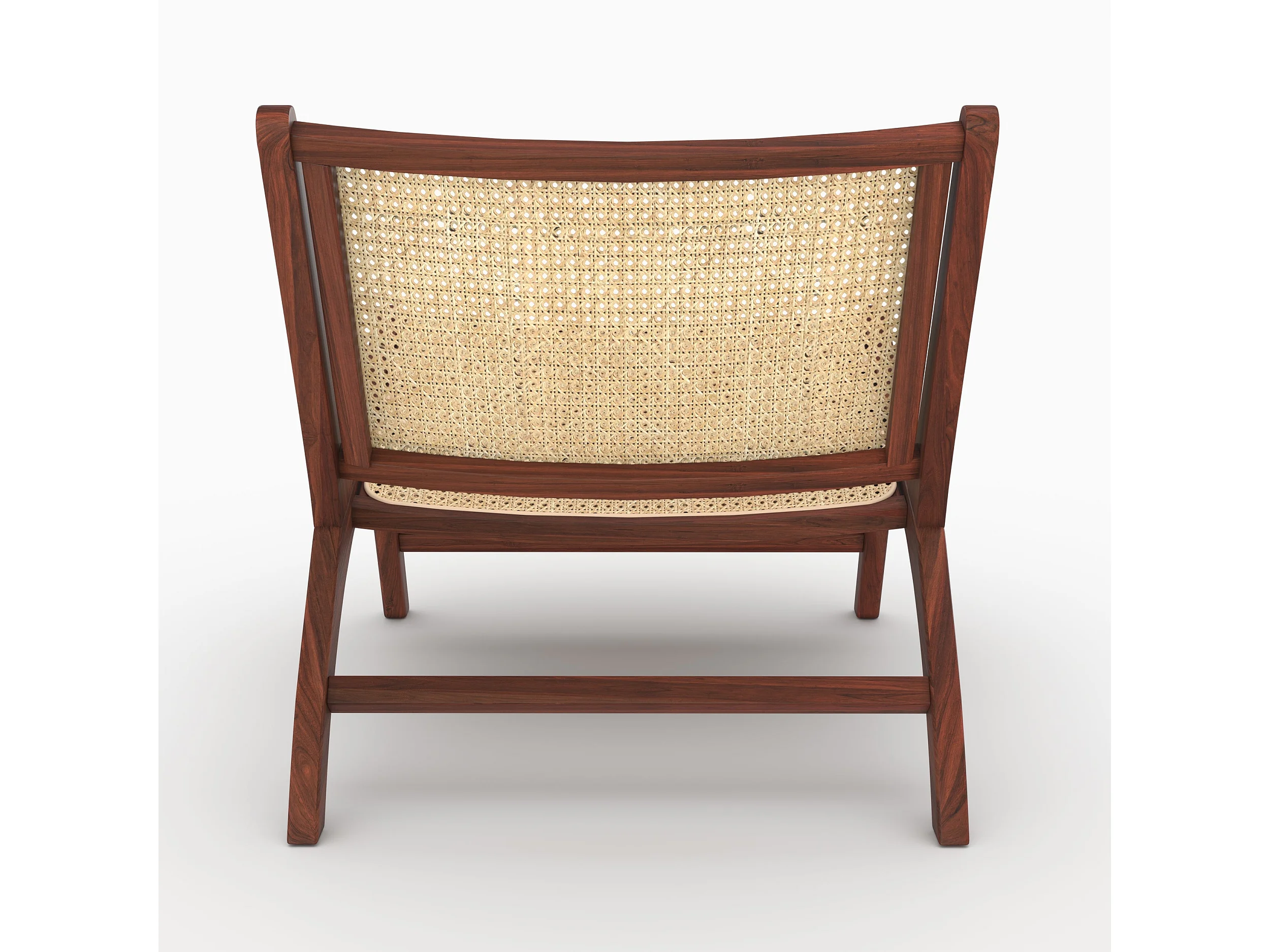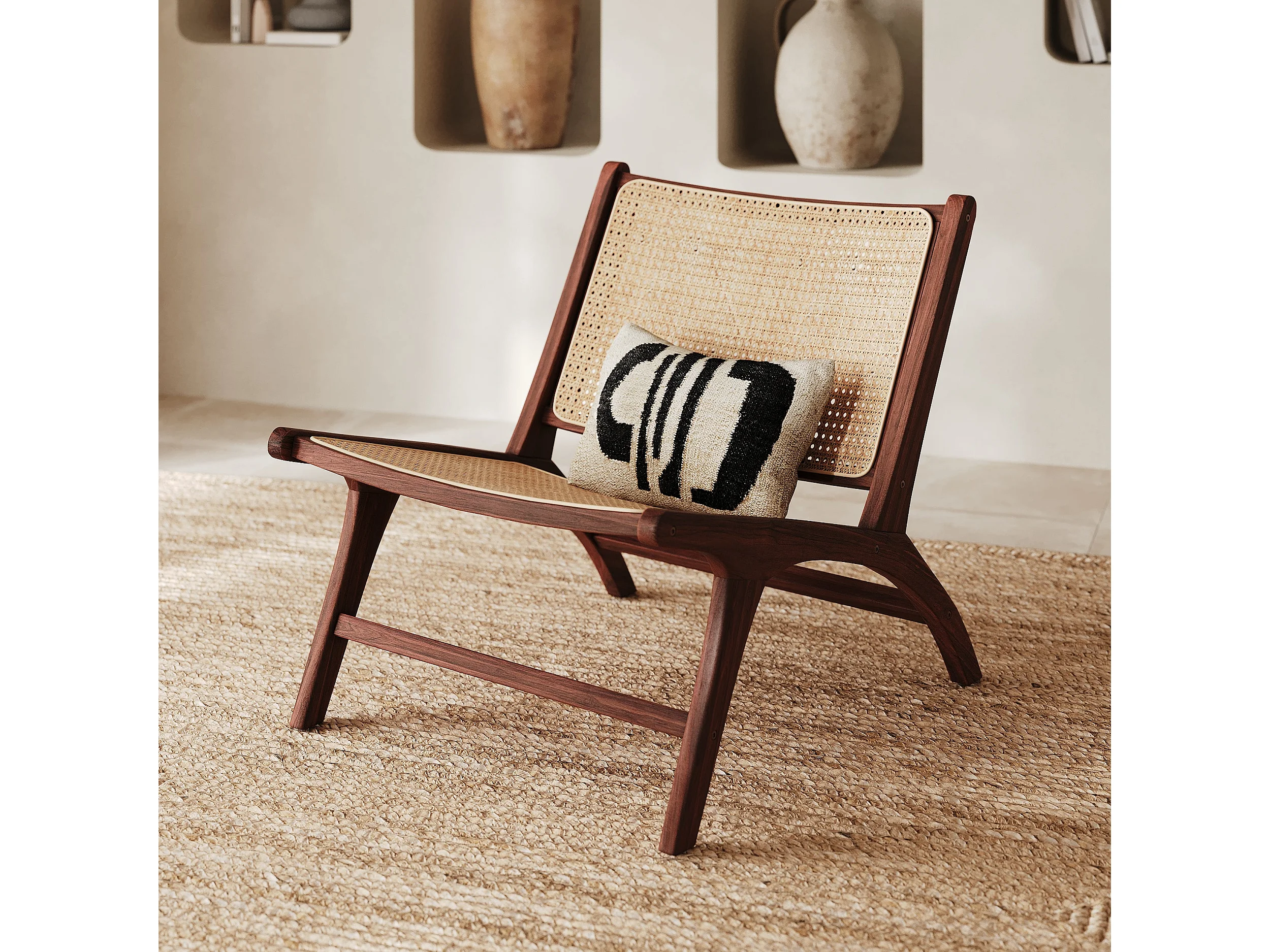 Sillón de madera de teca con acabado de nogal y trenzado de ratán. - Kilka