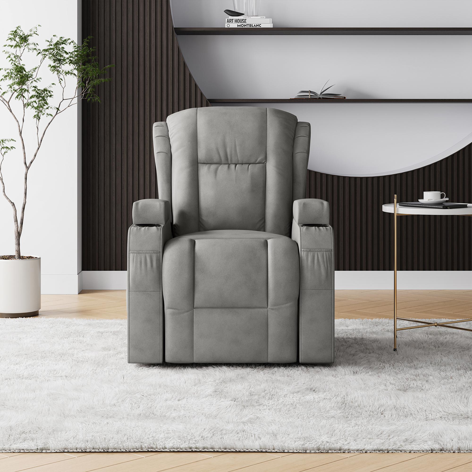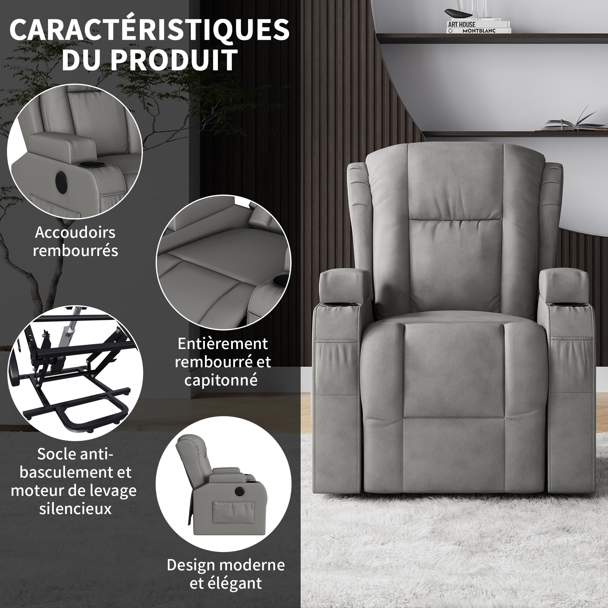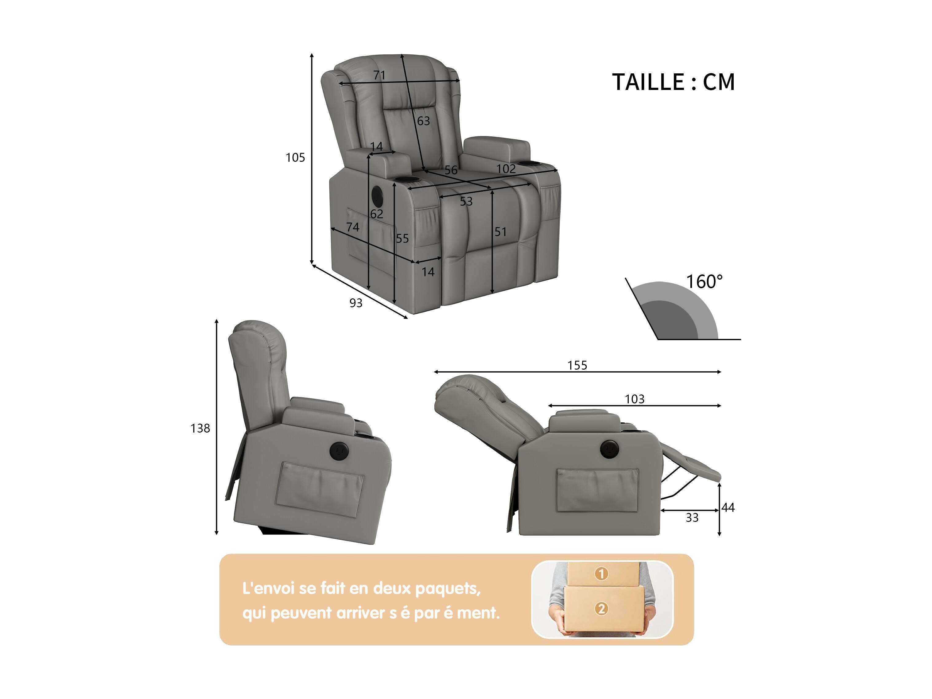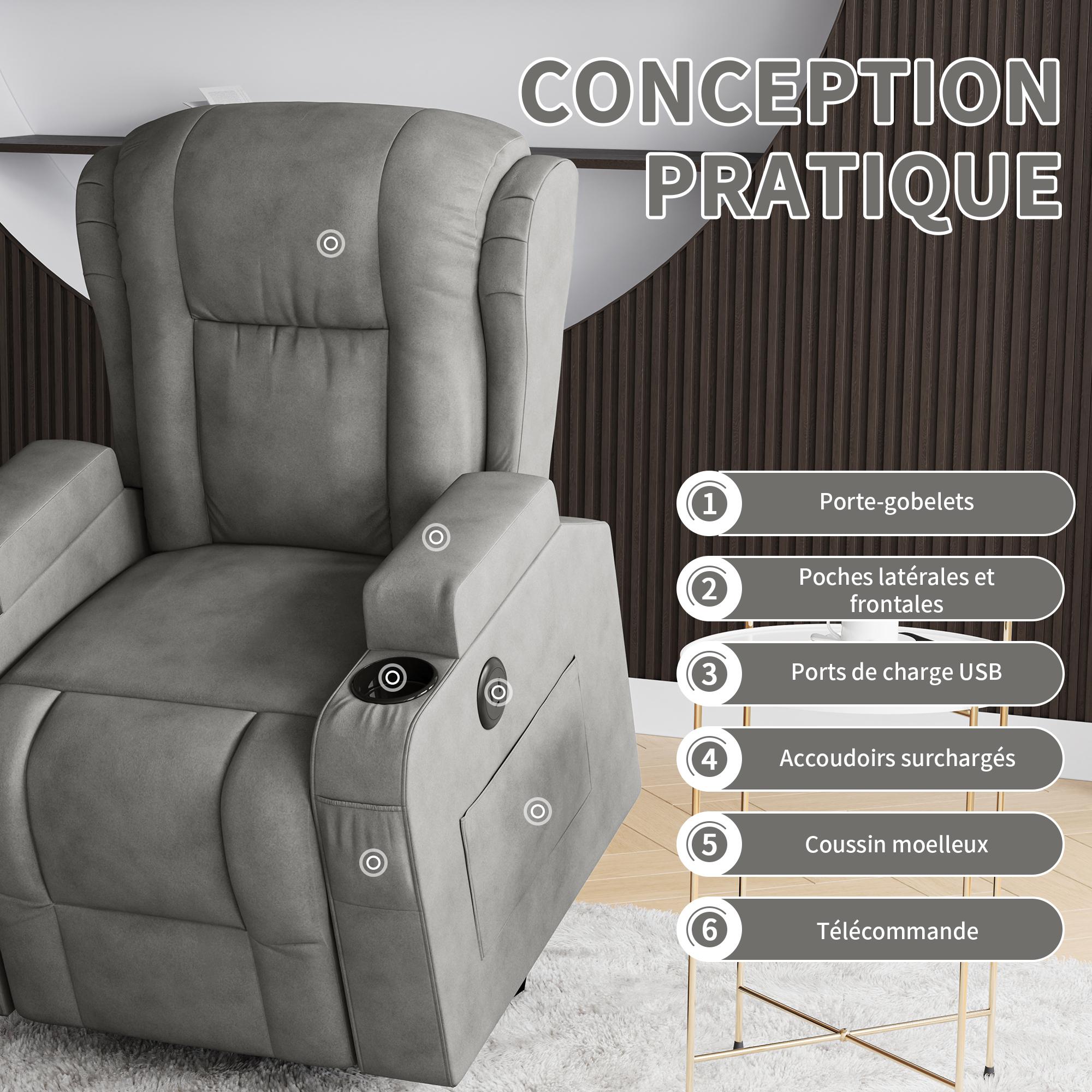 Sillón de masaje eléctrico gris con USB, portavasos, control remoto, función relax, vibración y calefacción.