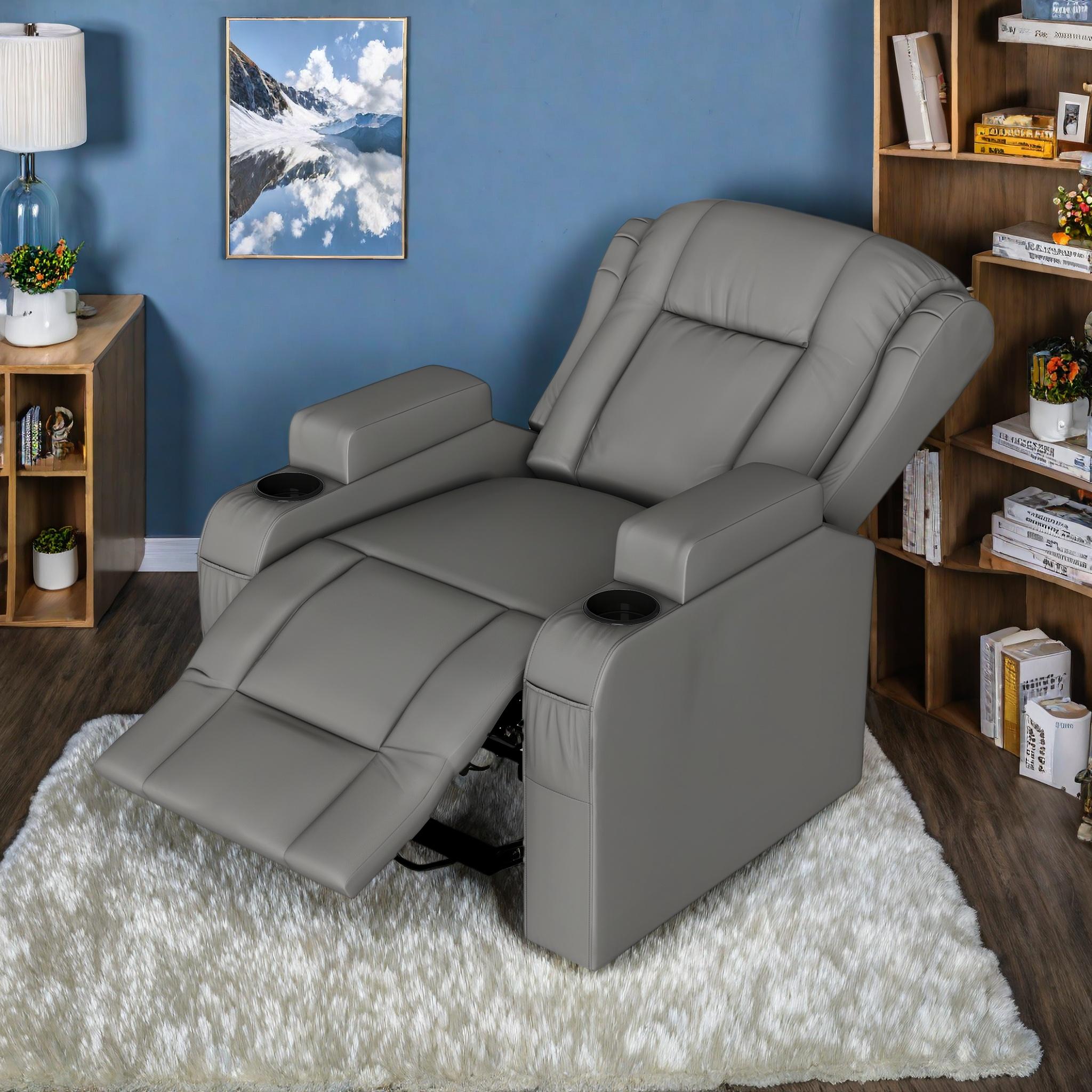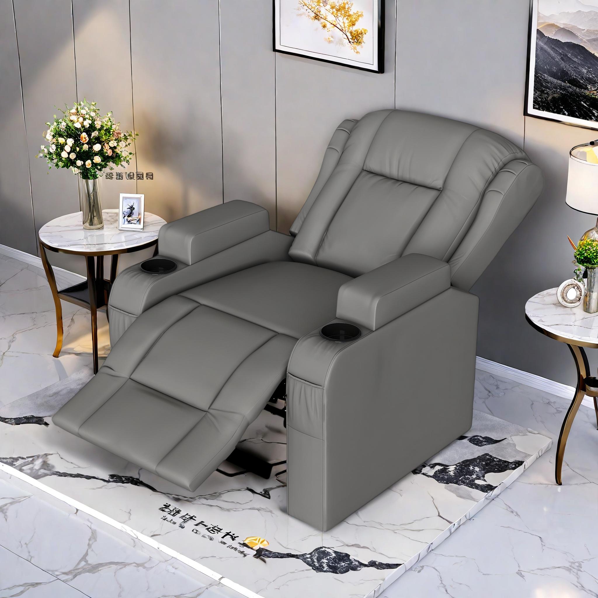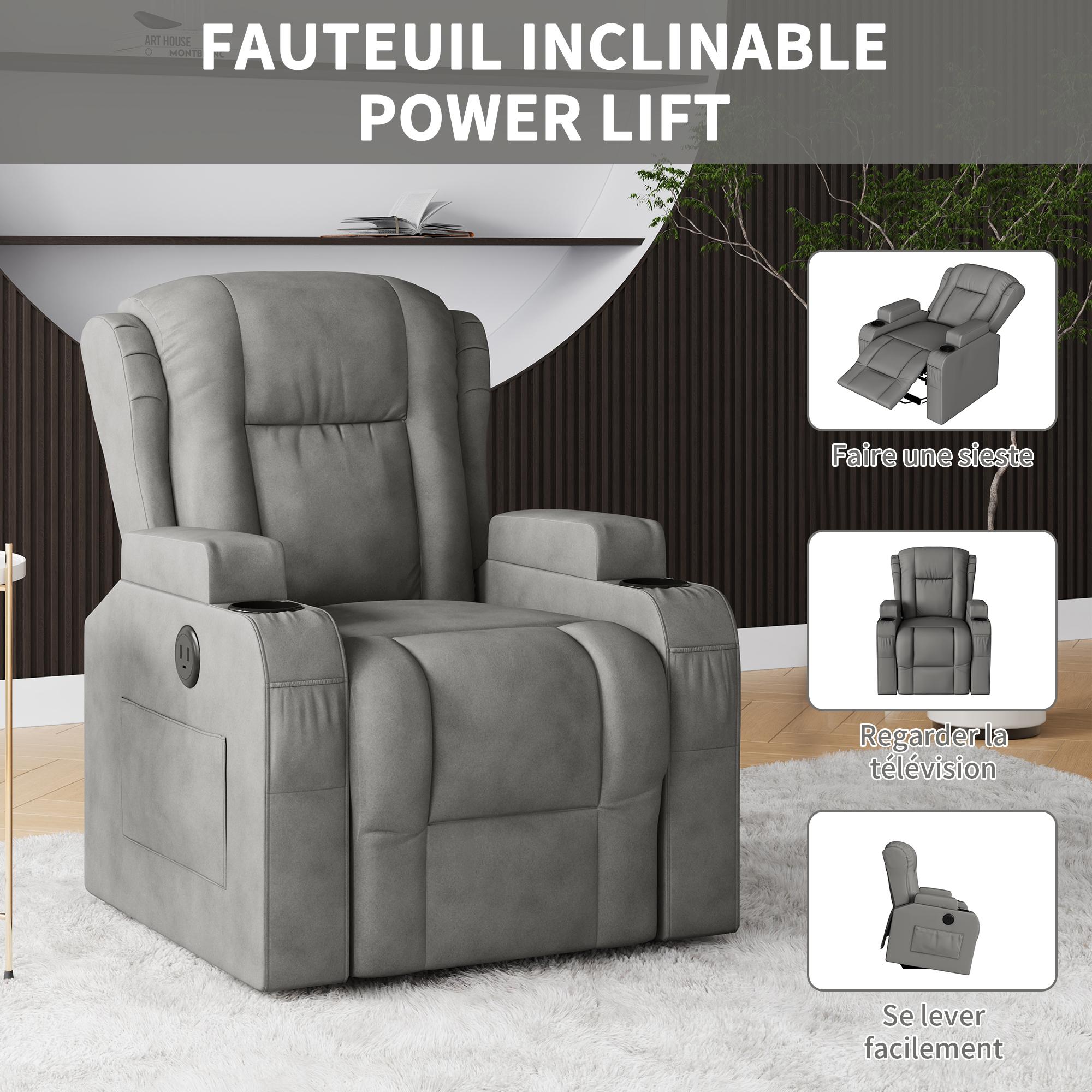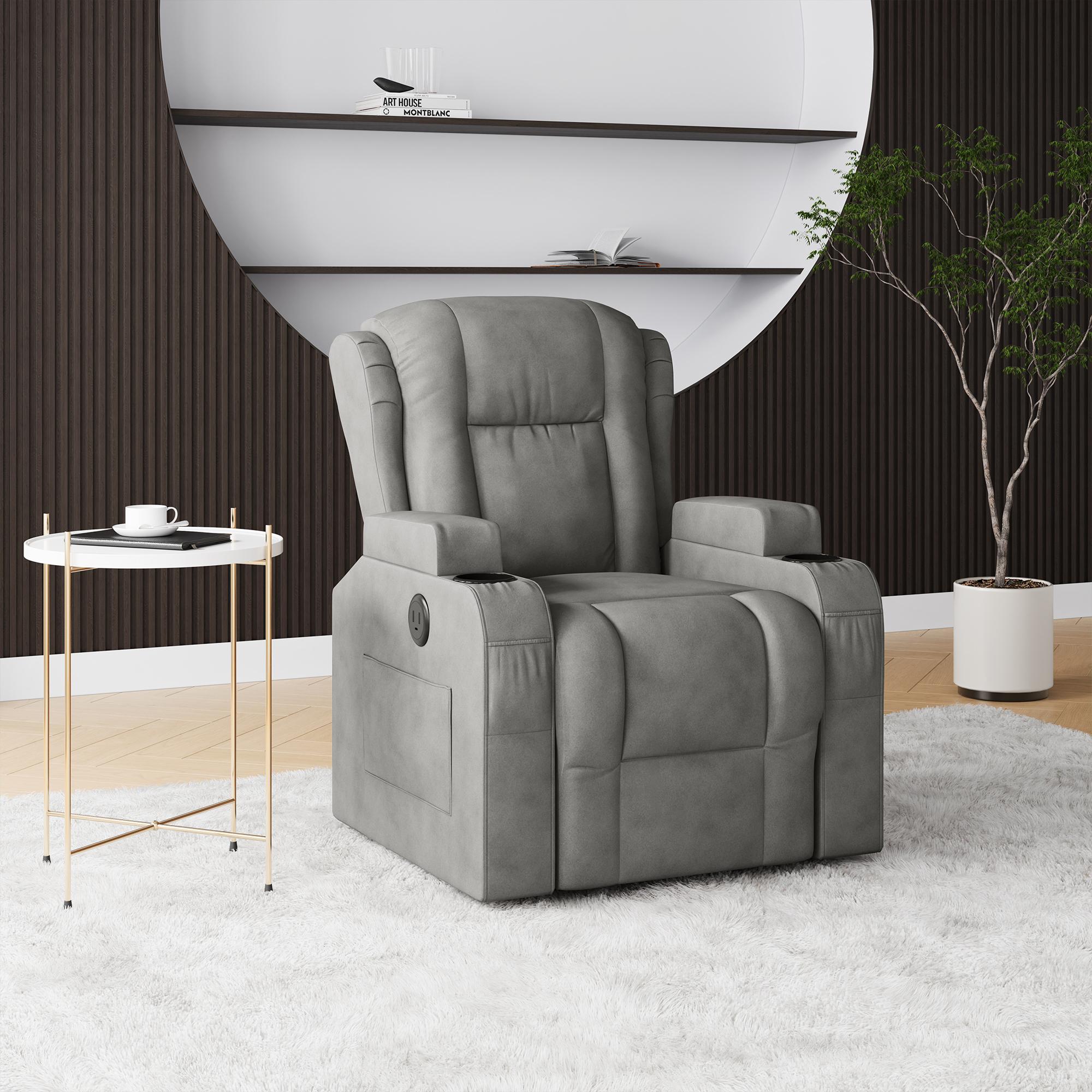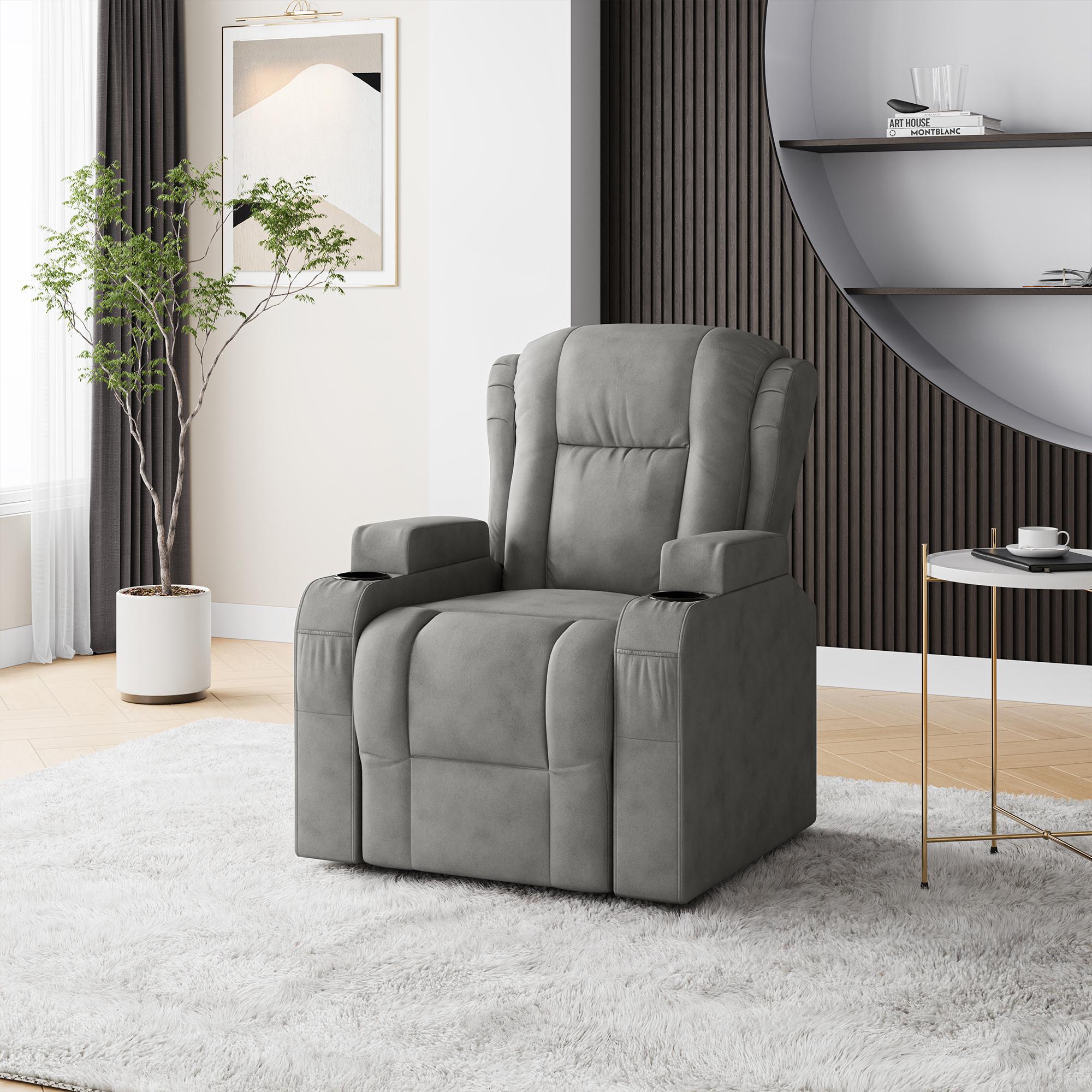 Sillón de masaje eléctrico gris con USB, portavasos, control remoto, función relax, vibración y calefacción.