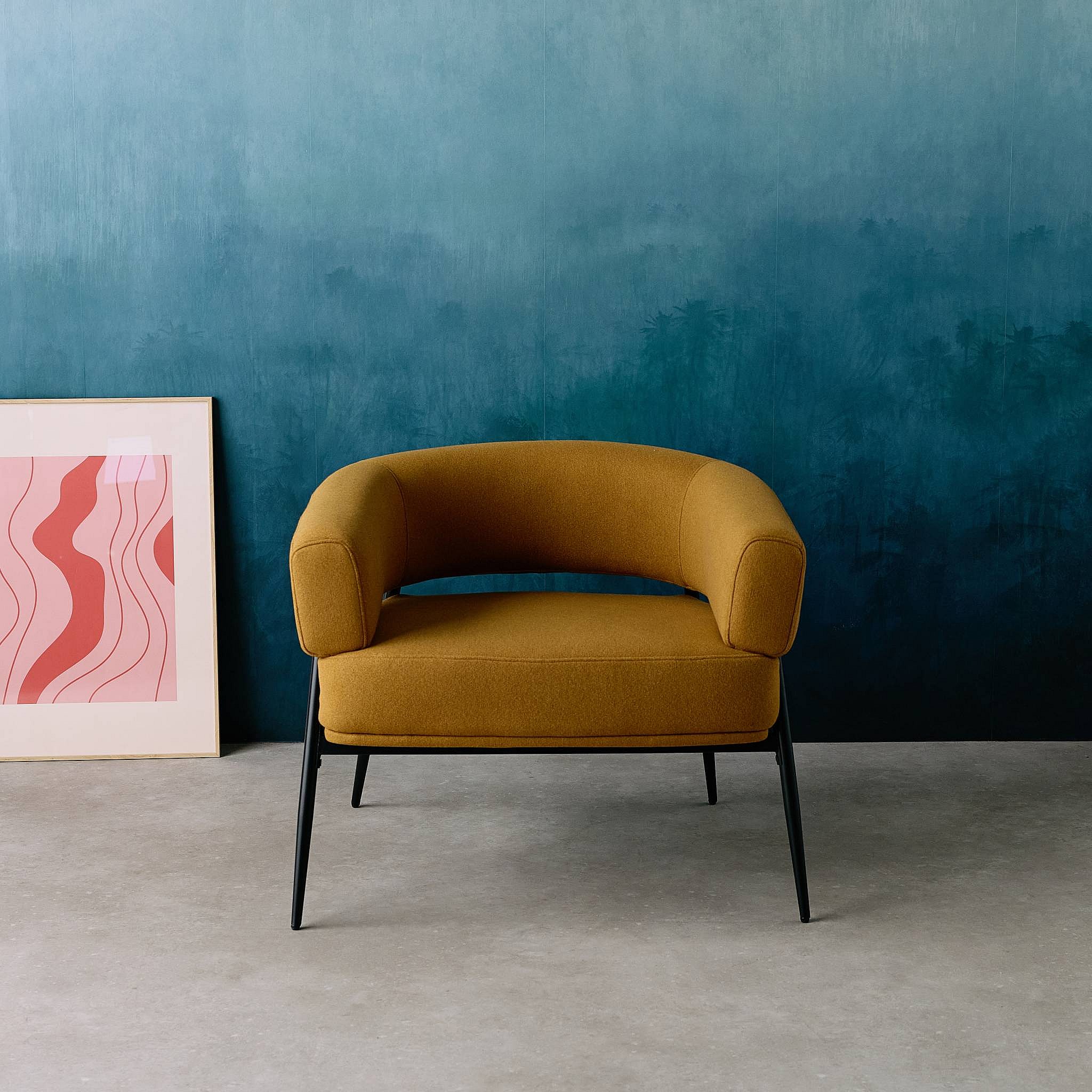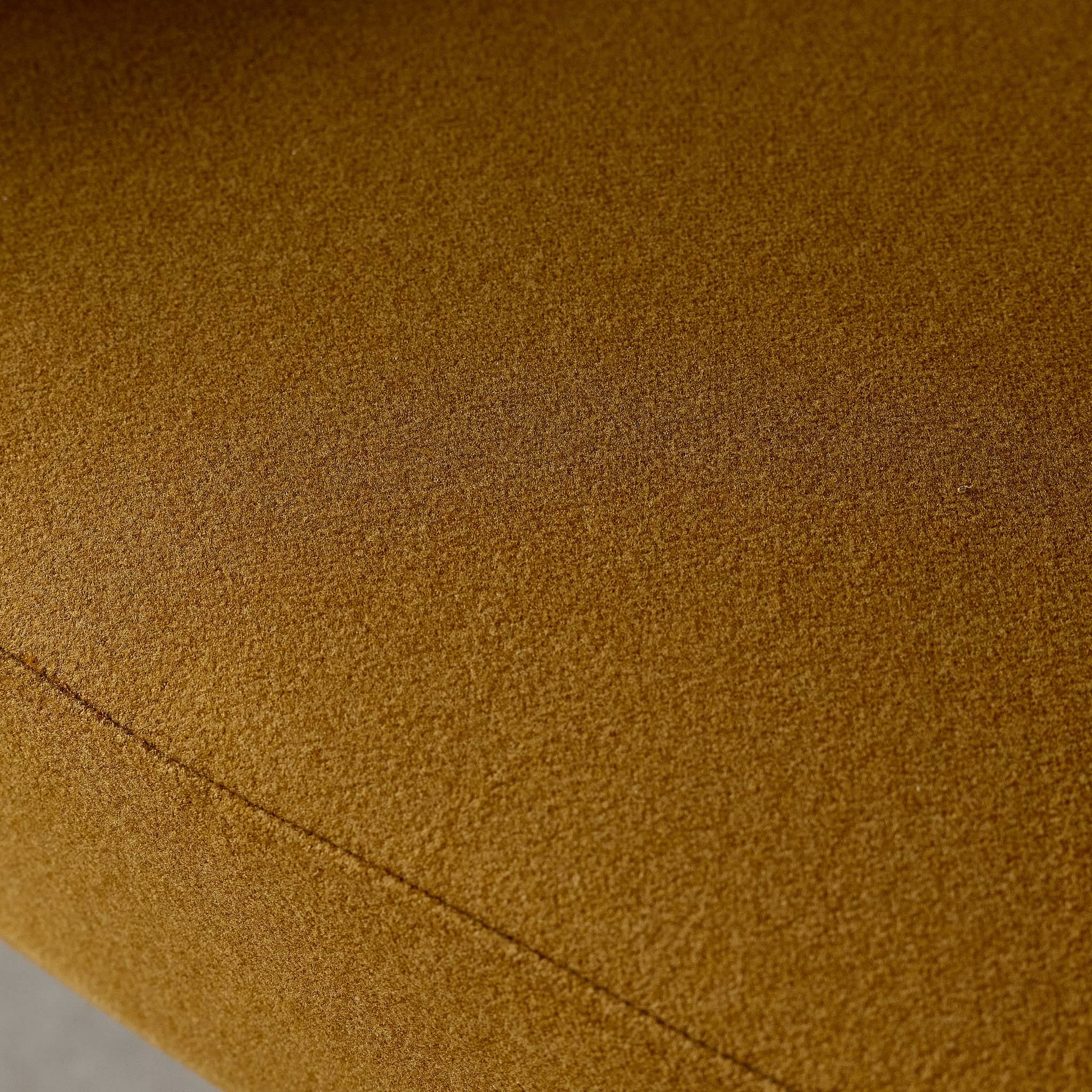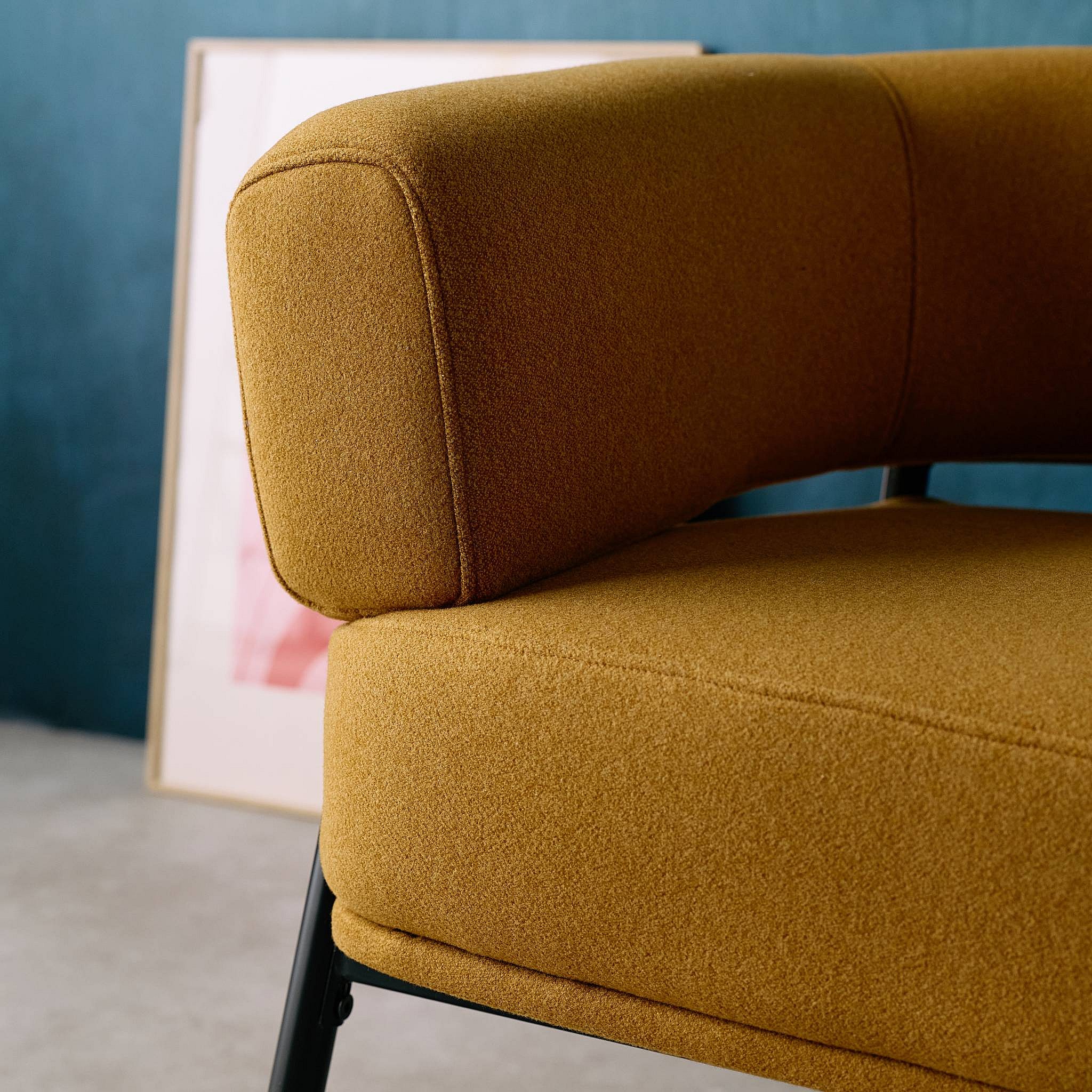 Sillón de tela con respaldo curvo y patas de metal mostaza